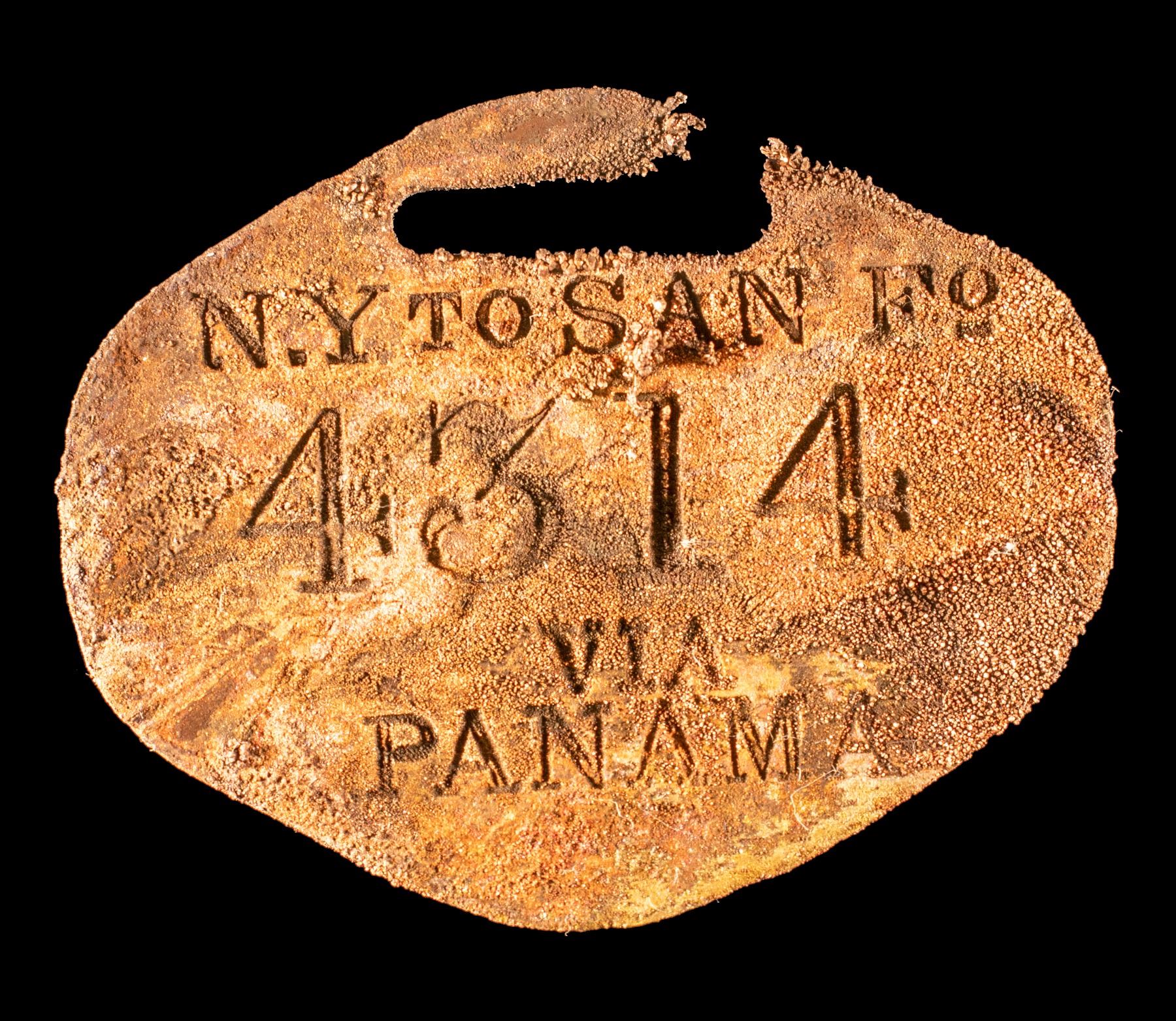 Brass luggage tag, approx 2 x 1-5/8 inches, embossed // N.Y. TO SAN Fo / 4314 / VIA PANAMA //. The name of the tag manufacturer is visible in very fine print on the back: // T.W. MOREHOUSE / J. CITY N.J. //