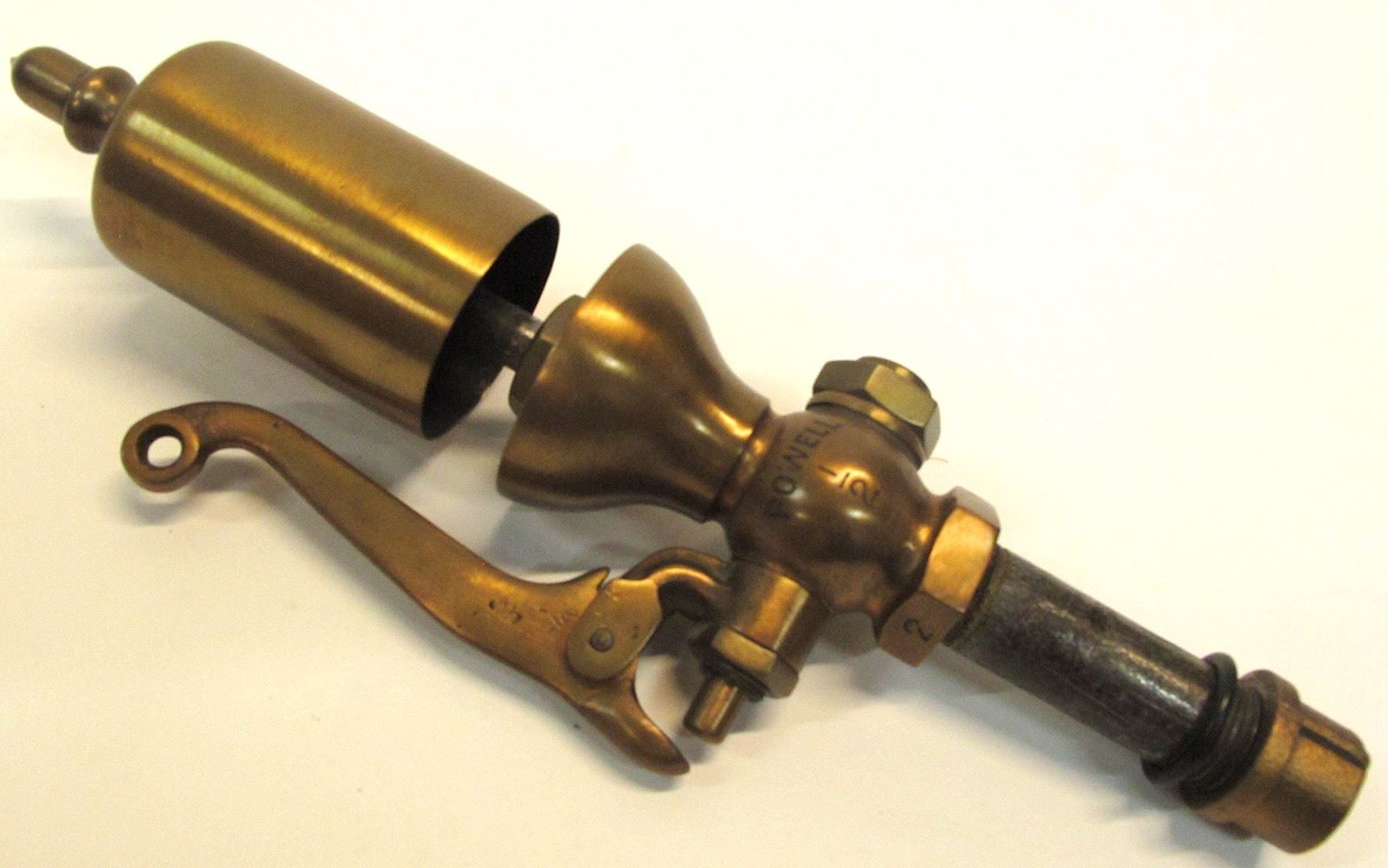 Brass Steam Whistle. Marked POWELL . Measures 8.5h long with added steel pipe insert. From Baltimore & Ohio Railroad Crane. Whistle dates from period 1900 to 1930 Date: Location: HWAC# 571911