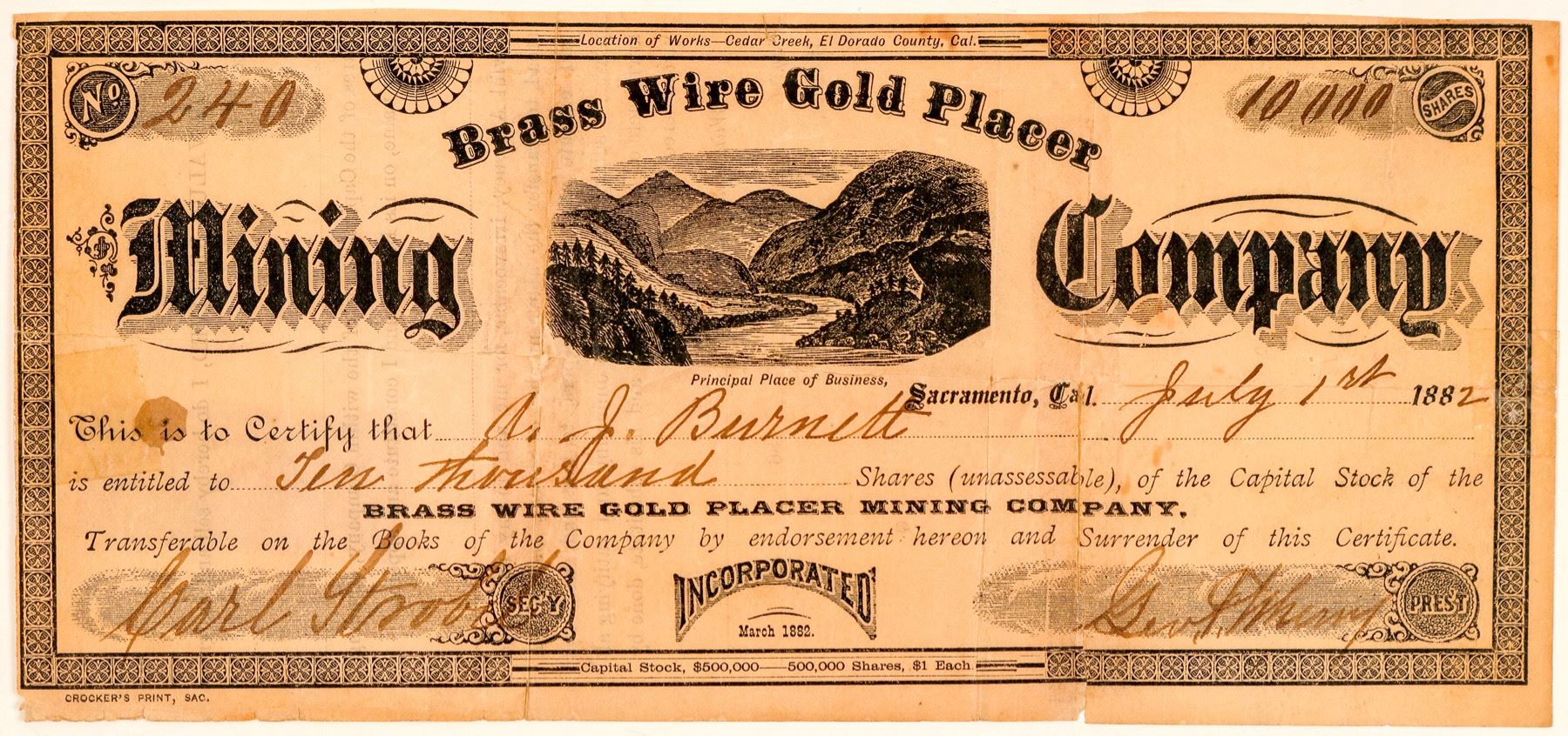 Location of Works: Cedar Creek, El Dorado County, Cal. (printed at top center). Rare "wire gold" mining company! Inc. March 1881. No. 240, issued for 10,000 shares A.J. Burnett of July 1st, 1882 in Sacramento. Signed by the president (illegible) and secretary Carl Strobil. Not cancelled. Black border and print. Vignette of river winding through mountains. Printed by Crocker's Print, Sac. 4 x 9" 25 cent adhesive revenue stamp attached on the reverse. Folds, heavy toning, tape repairs. Cedar Creek was located 0.5 miles from Coyoteville. (Prag Collection)