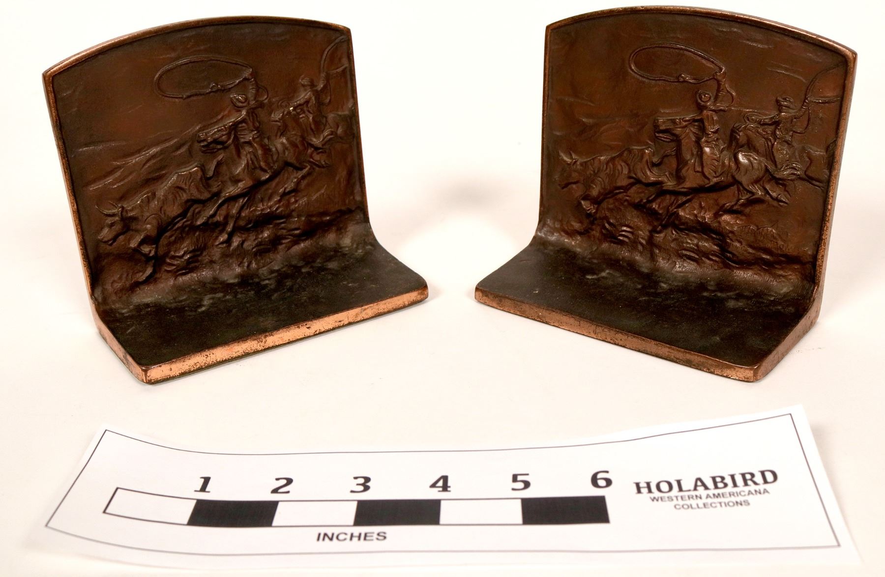 Great pair of solid brass bookends, marked BF & M Co. Raised images of cowboys roping steers. 4.5" x 5.5" x 2,75" each. Great western collector's items.
