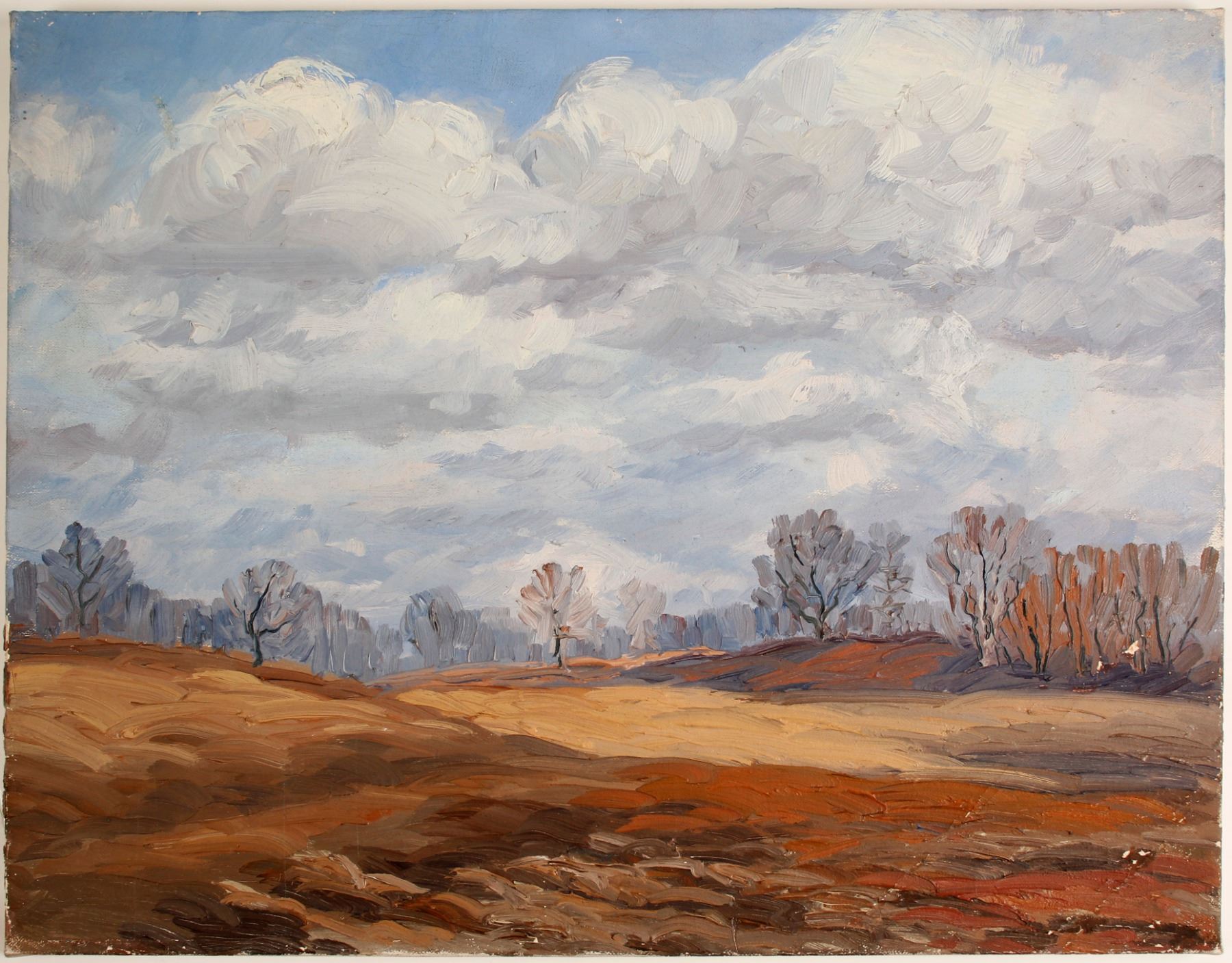 This painting is on canvas. It is called "Bre Trees in Winter Grove", on back of canvas is written "This picture was painted by my father". Cloudy sky, white clouds, trees in brown & lavender with foreground being color wheat, taupe, & some soft burnt orange. Ready to be framed! 20" x 12".