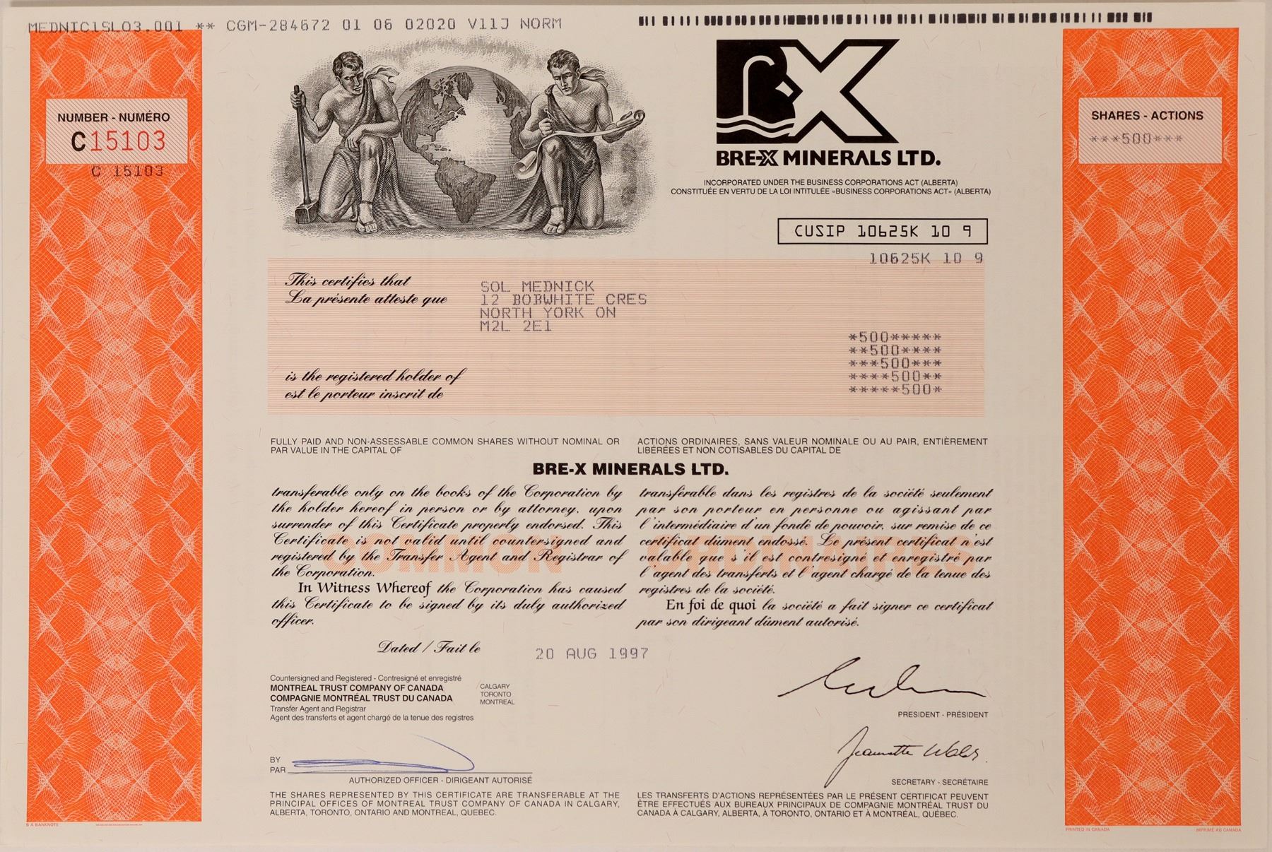 Bre-X Minerals, Ltd. stock certificate issued for 500 shares and uncancelled. The company announced in 1995 that they had discovered an enormous gold deposit at Busang, Indonesia of up to 200 million ounces. The Busang discovery made the Bre-X team including Mike de Guzman, the mining geologist a rock star in the mining world. When others tried to confirm the deposit, they found nothing. The company had partnered with Freeport McMoran Copper and Gold Company, which soon discovered that they had been duped. They called de Guzman to return immediately to Indonesia. Within days, Mike de Guzman threw himself out of a helicopter over the jungle. His body wasn't found until four days later after being eaten by wild boars. There is speculation to this day that Mike de Guzman faked his own death as no DNA test was ever done on the remains. How did Bre-X do it? Their crushed core samples were salted with gold to create the most elaborate fraud in the history of mining. Bre-X stock went from a penny stock to a peak of $286.50 per share Canadian and a total value of $6 Billion. Any certificate from Bre-X is rare, but this one is particularly so as it's issued for 500 shares. The unlucky shareholder had a peak value of $143,250 Canadian and rode it to zero (wikipedia, the canadianencyclopidia.ca. That hurts. The certificate is in VF condition and is uncancelled. This is the first time we have offered a Bre-X in a Holabird auction.