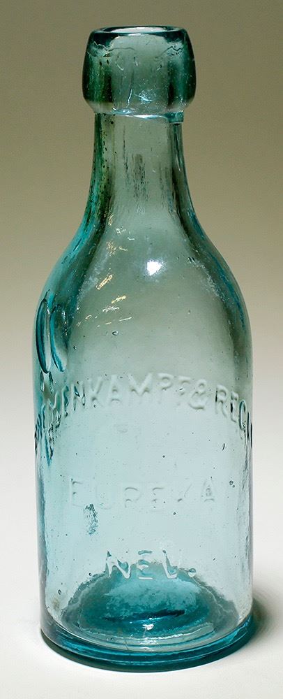 Bremenkampf & Regli // Eureka // Nev // 1878-1885 : Brilliant aqua applied top. Beautiful specimen, with a lot going for it. . Clean with light whittle. Large 3/4" x 3/8" bubble, on the left front shoulder over the embossing. And, on top of that, a greenish swash of impurities. On the reverse side of the bottle, in the neck area are 4...1/2 "- 3/4" tear drop bubbles !! This is an EXCEPTIONAL specimen...get it !! Date: Location: Eureka, Nevada HWAC# 56022