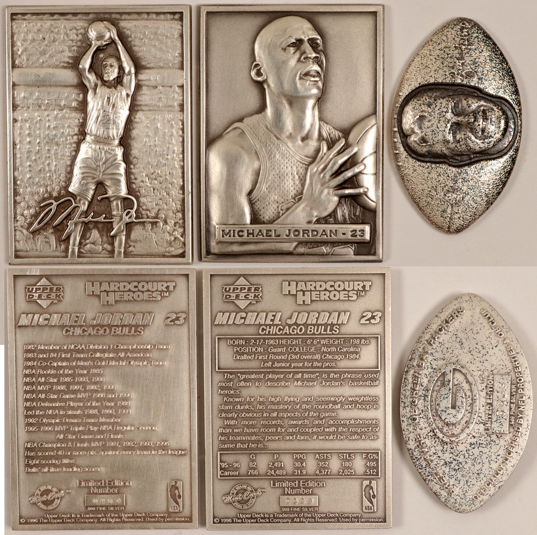 Three limited edition silver ingots: 1) Brett Favre: the Highland Mint "Mint-Coin" #3323 of 5000, football shaped ingot in original gridiron case with certificate of authenticity. 2 & 3) Michael Jordan silver ingots from the Highland Mint: # 0104 of 5,000; in original case (some damage) with certificate of authenticity.