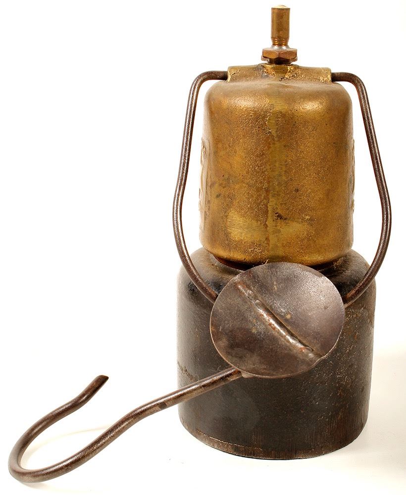 Large carbide. BREVETE, S. G. G. G. Foreign, heavy duty carbide lamp. This is an unusual lamp with the reflector on the handle. The only one in the collection. Date: Location: HWAC# 47162