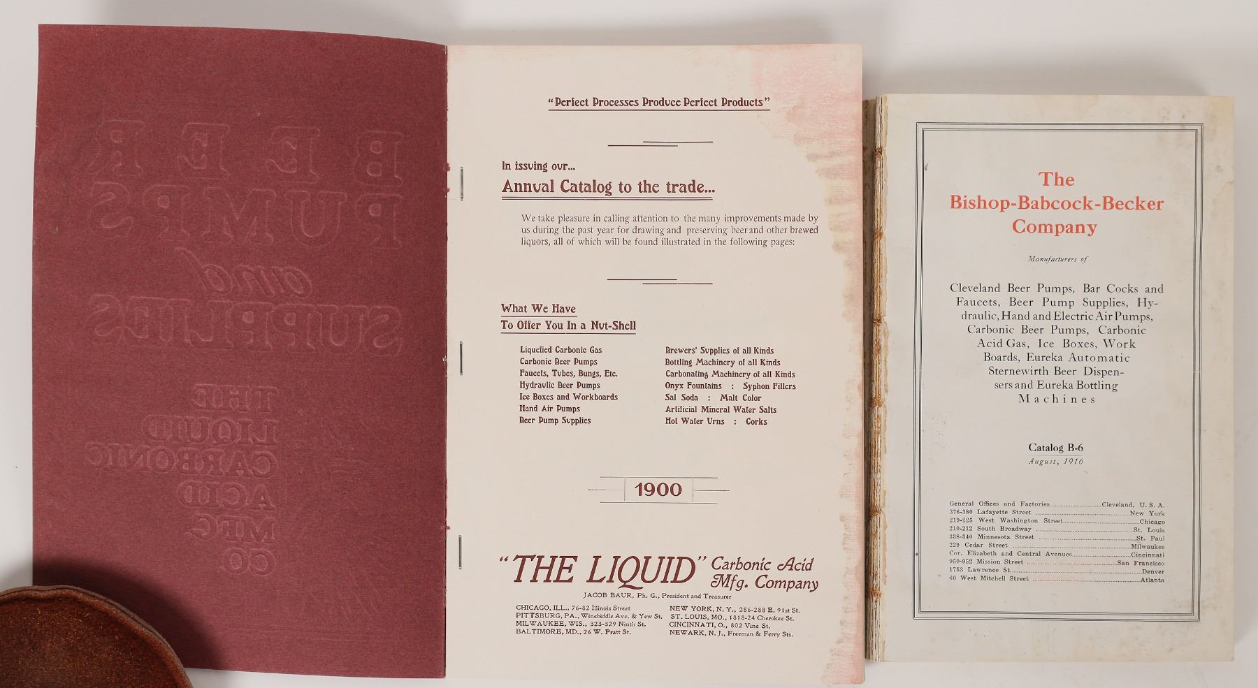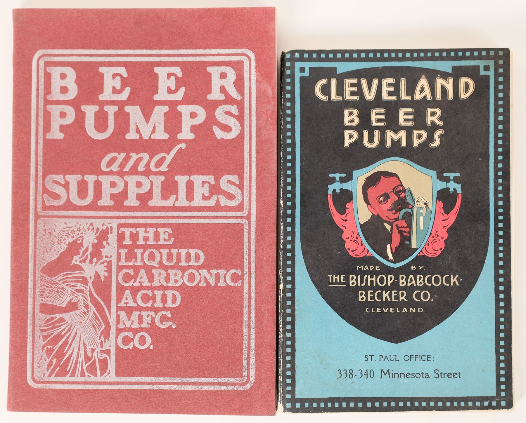 2 vintage brewing catalogs. Cleveland Beer pumps, 1916, colorful cover with detaching spine. Beer Pumps and Supplies, The Liquid Carbonic Acid Mfg. Co, 1900, the first 14 pp have upper right stain and sticking.