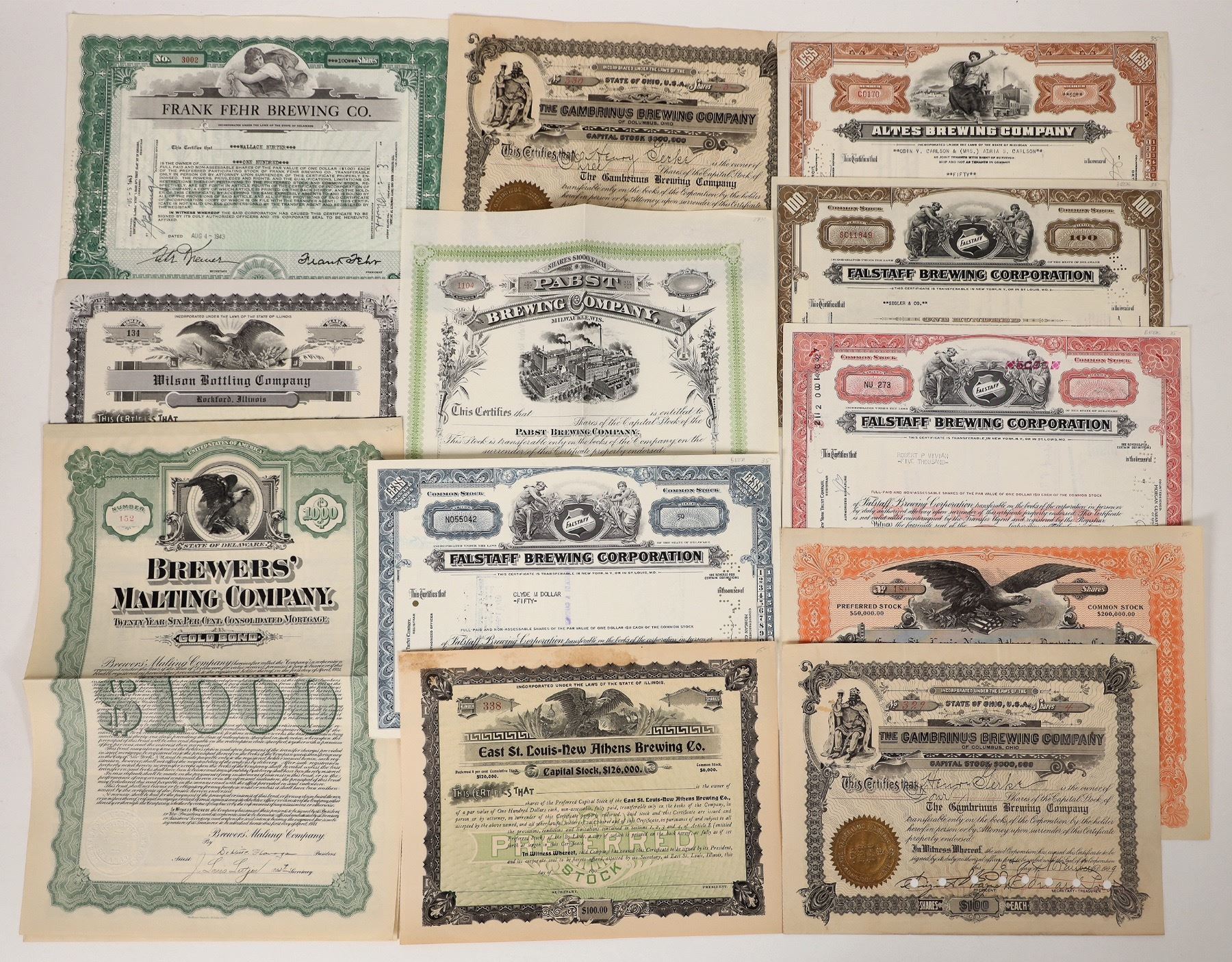 Brewery stocks include The Gambrinus Brewing Company 1909, Altes Brewing Company 1949, Wilson Bottling Company No Date, Falstaff Brewing Corporation 1949 and more. Please see photos for more details.