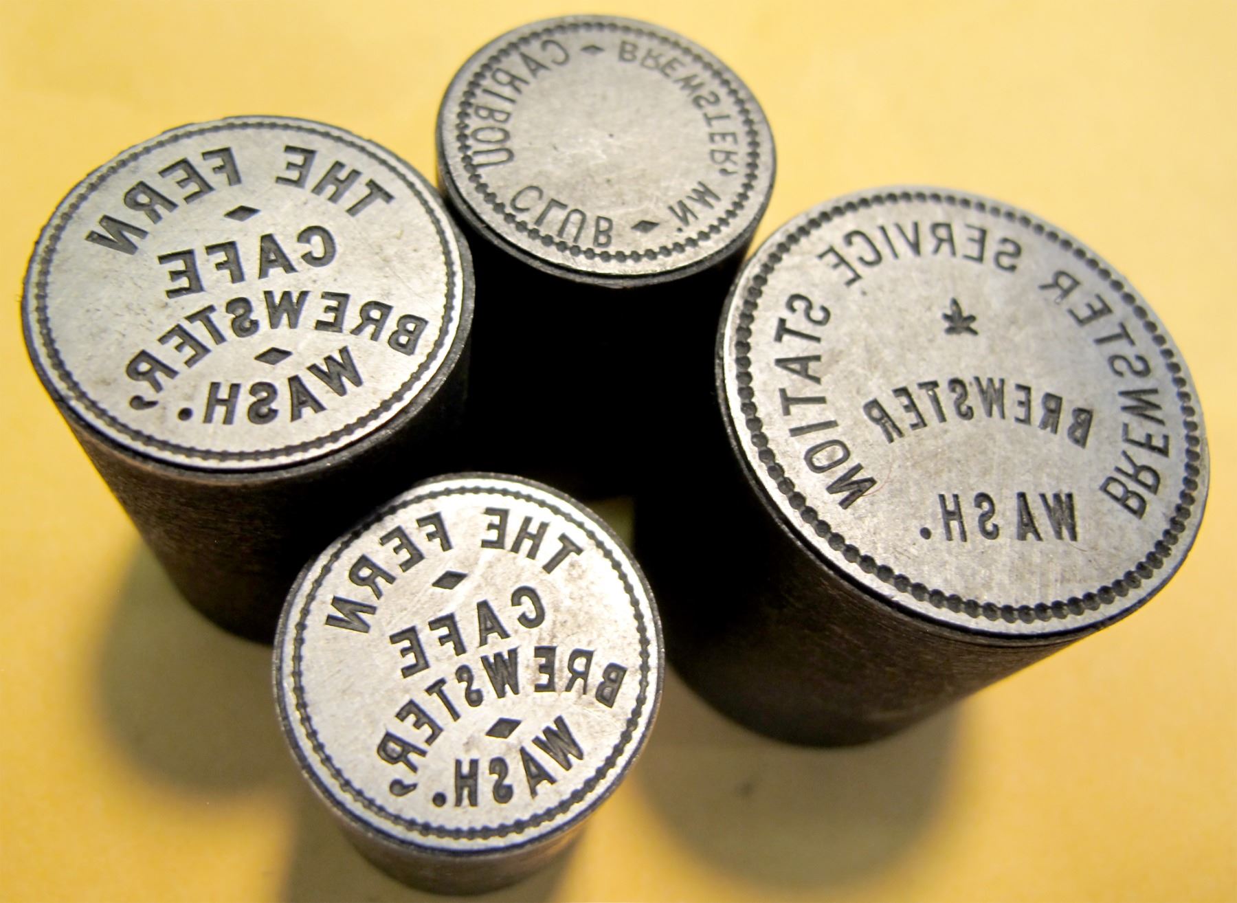 Lot of 4 Die. Self-identified from Brewster Washington. 13 mm: The Fern Cafe; 19 mm.: Caribou Club; 22 mm.: The Fern Cafe; 32 mm : Brewster Service Station. Northwest Territorial Historical Die. Collection.