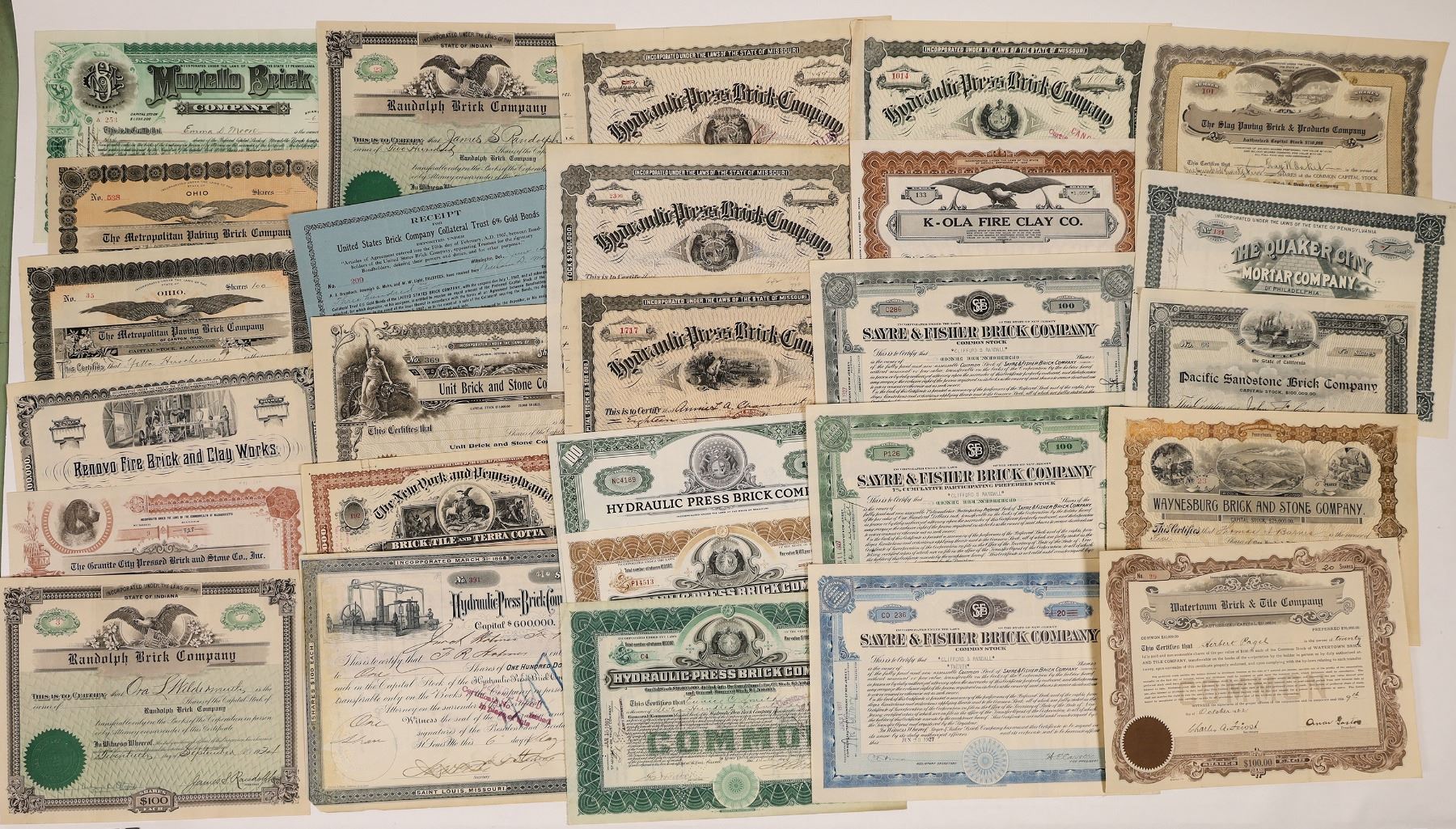 A very nice collection of 33 brick manufacturers, mostly 1890s-c1920. Includes Montello Brick, i/uc, 1903; Metropolitan Paving Brick Co., 1909, i/c; Renovo Fire brick and Clay Co., 1897, printers proof, spectacular vignette, 1897; United States Brick Co. bonds, 1904, i/uc; Hydraulic Press brick Co., 1887, i/c; New York and Pennsylvania Brick, Tile and Terra Cotta Co., 1898, i/uc and many more. please see photo.