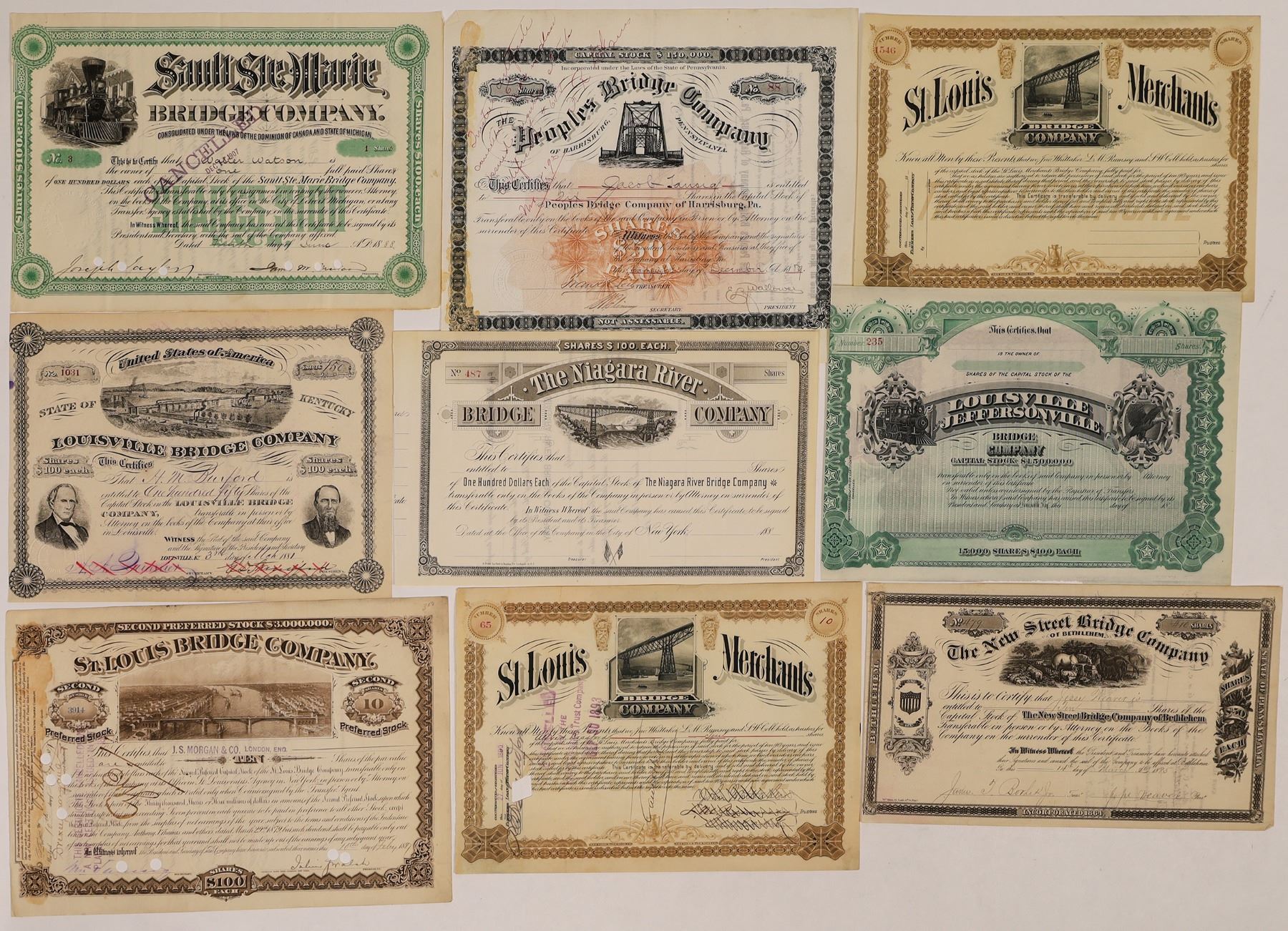 9 different bridge companies, most with nice vignettes. Many of these companies built bridges specifically for railroad transportation. Includes Sault Ste. Marie Bridge Company, 1888, i/c; Louisville Bridge Company, 1881, i/c, great vignettes; St Louis Bridge Company, 1881, i/c, great vignette; Peoples Bridge Company, 1889, i/c; and more.