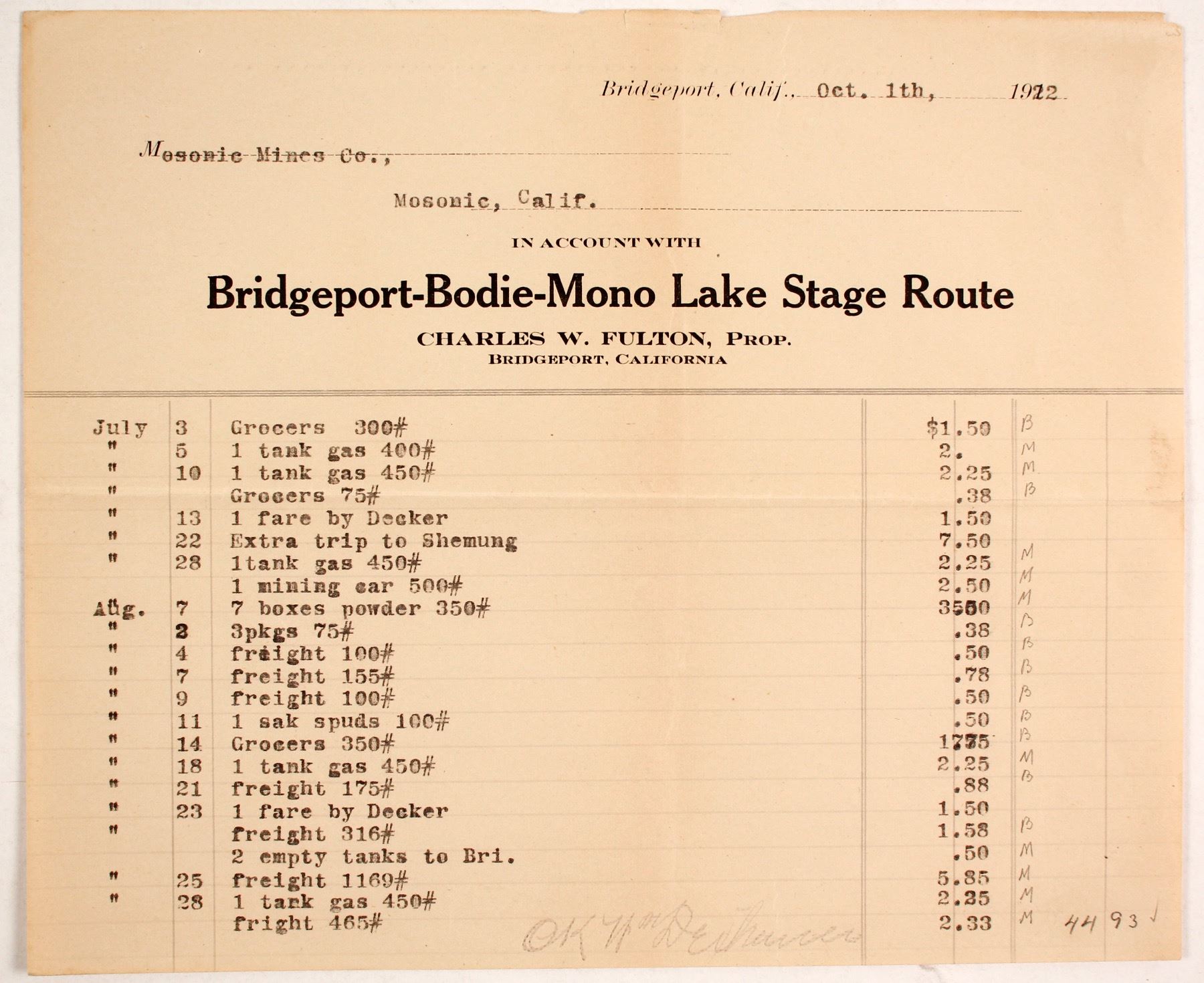 Rare Stage billhead. Masonic Mines, Co. Masonic CA. Date: 1922 City: Bodie State: California HWAC# 76046