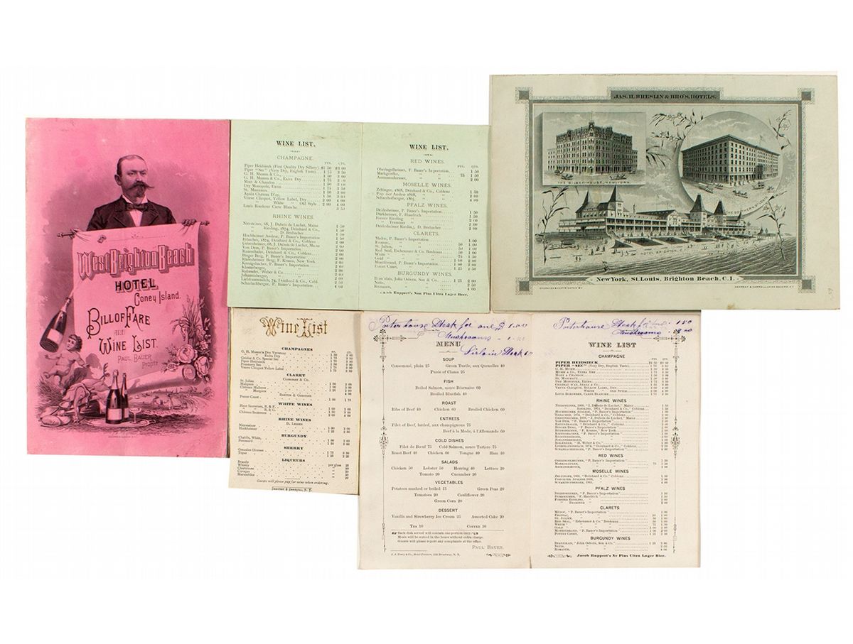 This is a really fun lot from the resort town of Brighton Beach. This lot has 5 various wine lists and menus from the various establishments during the 1870s-1880s. Just some of the wines featured in the menus are; champagnes, Rhine, burgundy and Moselle. 1) West Brighton Beach Hotel bill of fare and wine list for June 15, 1882. 2) Another item from the West Brighton Beach Hotel, only this was for the 1879 Arion Sea-side Summer-Night’s Festival. 3) Small wine list from an unknown location. It features a short list of champagnes, claret, white and Rhine wines, burgundy, sherry and liqueurs. 4) Hotel Brighton dinner and wine list from August 23, 1882. 5) Another item from the West Brighton Beach Hotel’s 1879 Arion Sea-side Summer-Night’s Festival. This is just a small wine list from the hotel.City: County: State: NYDate: c1870-1880