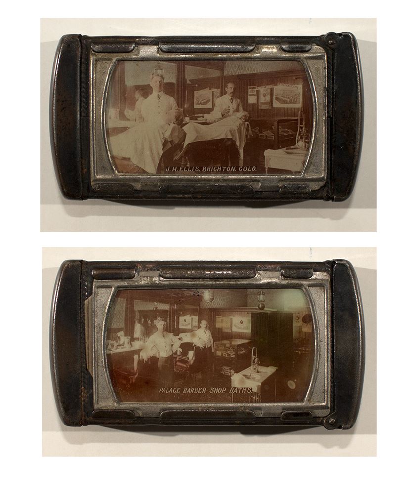 Brass match safe, J. H. Ellis, Brighton, Colorado; photos of Palace Barber Shop & baths on each side.