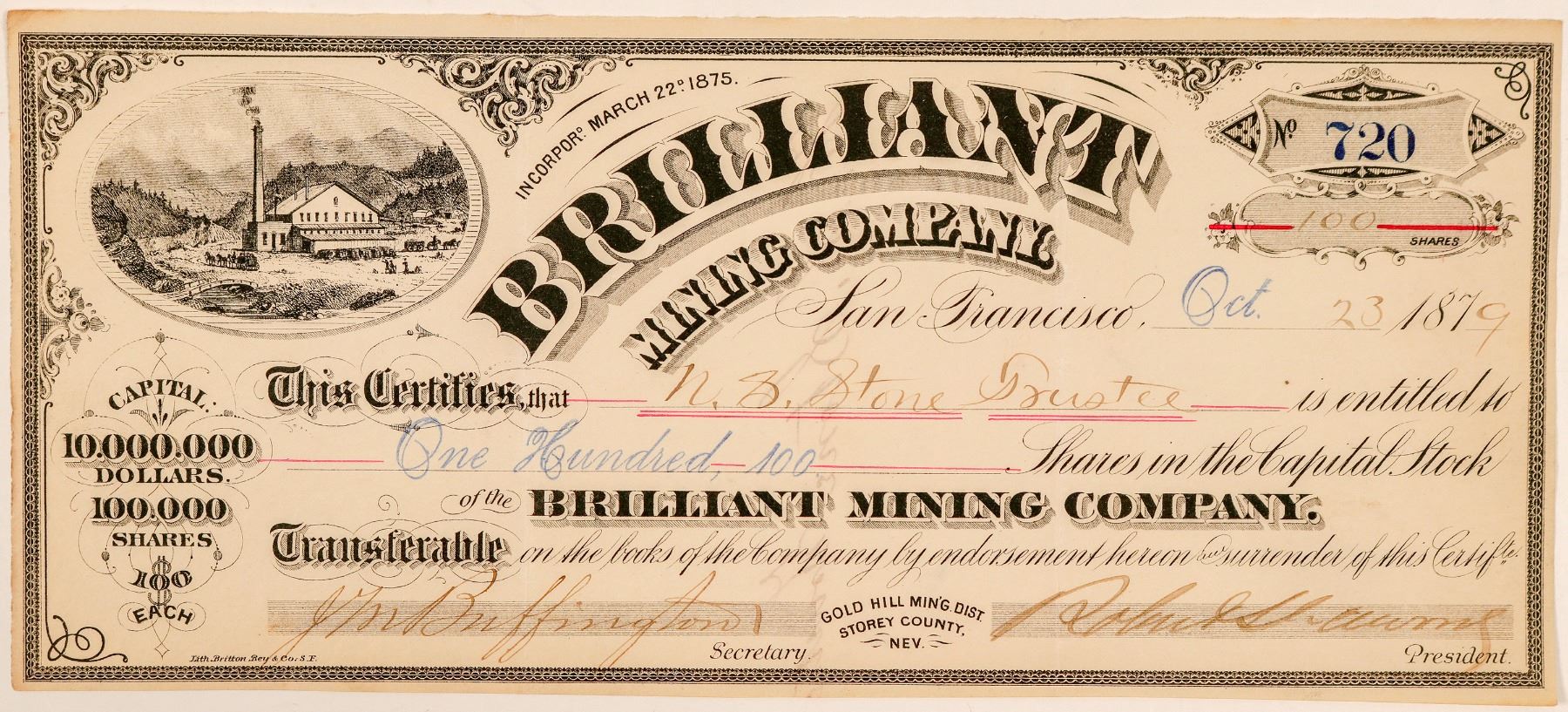 Wow! Gold Hill Mining District, Storey County, Nev. (printed at bottom center).Inc. March 22, 1875. No. 720, issued for 100 shares to N.S. Stone on Oct. 23rd, 1879 in San Francisco. Signed by president Robert Sherwood and JM Buffington, secretary. Not cancelled. Black border and print, birds-eye vignette of mine and mill. Lith. Britton & Rey, SF. 4 x 8.75" Folds, light toning. The mine was located on the Alta Company's Ledge north of the Boyle. A 3 compartment shaft has been sunk and a drift has been run in at the 1,000 ft. level from the New York Shaft. The claim is 1,481 ft. wide. The other two claims originally incorporated under the company are the Sherwood Cons. and Curtis Cons. [Ref: United States Annual Mining Review and Stock Ledger, 1879, pg. 177] Ken Prag Collection