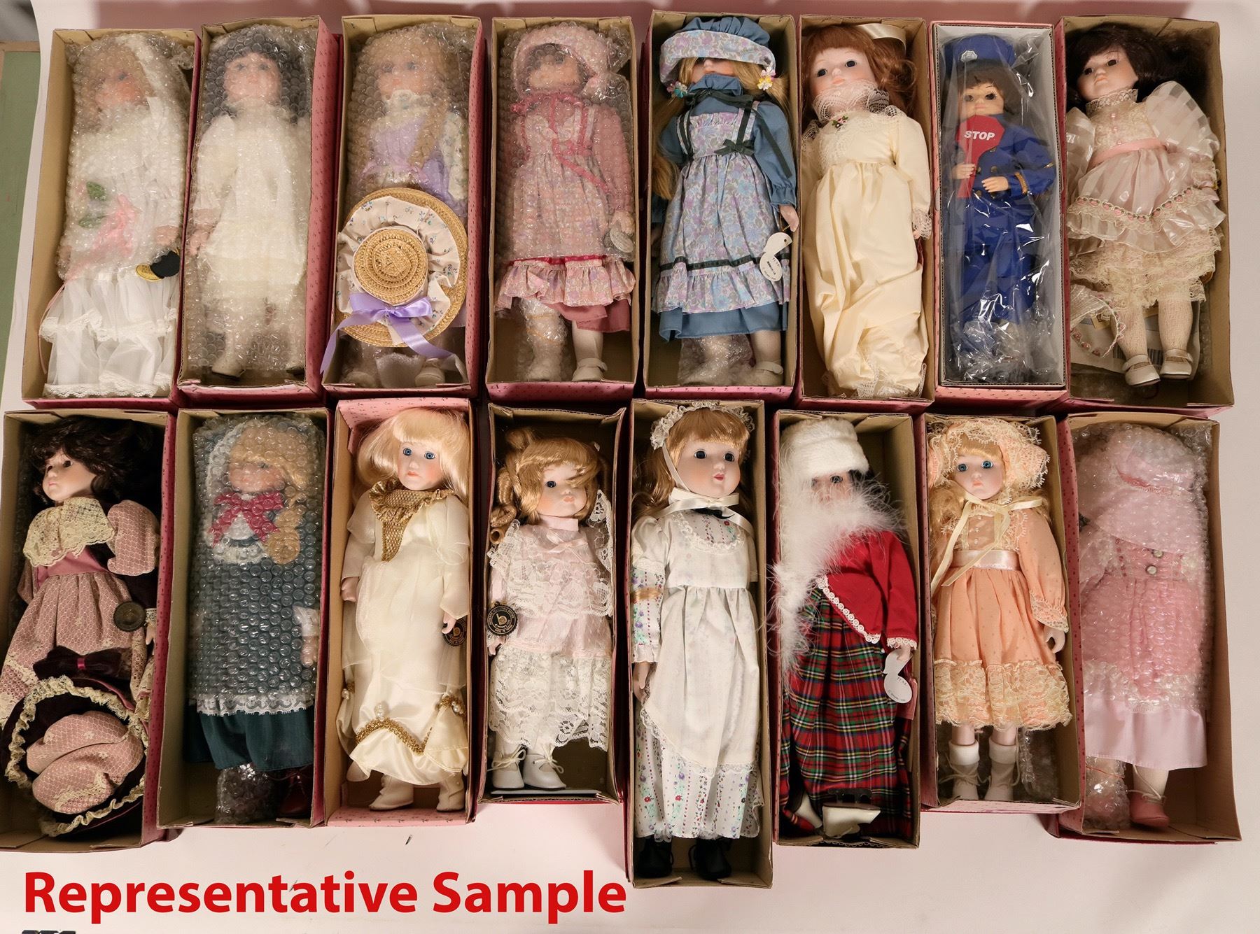 About 59 Brinn's dolls (43+ different) , all in original boxes, generally never came out of the boxes. Generally about 12" tall. A few larger, a few smaller. Names:Now is Love, Nanette, What World Neen Now (2), Everything is beautiful, Molly, Lindsay, Flora Belle (2), You Light up my life, Freddie (2), Sound of Music, Aimee (2), Lara's Theme, Little Boy Blue, White Christmas, Tea for 2, Marcy, Megan, Rapunzel, Feelings, Kimberly, Miss January (music), Goosy Gamder, The Way we were, Dancing Country Doll, Grow Up (baseball), Mary had a lamb, Fascination, Kristin, Stefanie, Sleeping Beauty, December Calendar Clown, Irene, Postman, Jennifer, Fireman, Jack be nimble, Nina & Nicky, and ten others. Porcelain: November, December, April, July, Tim Kim and 2 others. The Brinn dolls have been is storage since approximately the late 1980s. Some boxes are dusty.