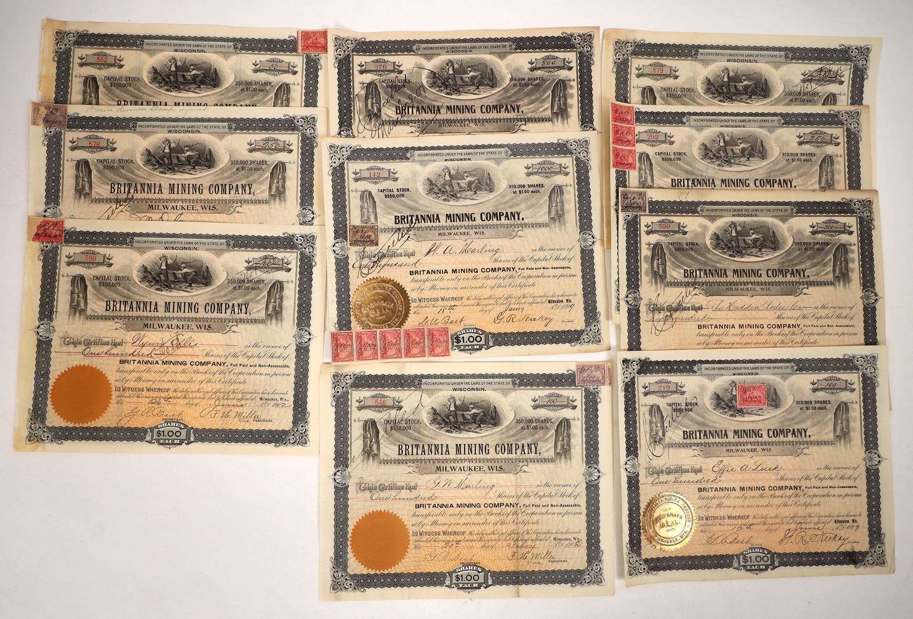 A collection of 10 stock certificates from Britannia Mining Co., Milwaukee, Wisconsin, c1899-1902. Vignettes of miners, all issued and canceled, several with revenue stamps. All signed by G.R. Best as secretary, with: 1899-1901 (4) signed by G.R. Nickey as president; 1901 (1) signed by H.H. Greene as vice-president; and 1902 (5) signed by F.H. Miller as vice-president.