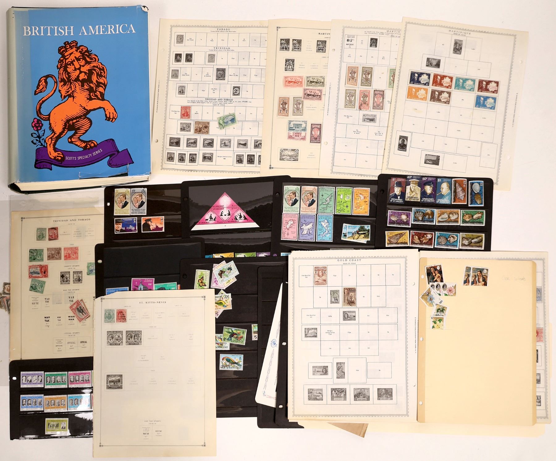 Scott British America Album, copyright, 1976, about 3" thick plus approx. a dozen other British colonies with pages removed from older albums. This album is perhaps 20 percent full of mint stamps unhinged in protective sleeves. Hundreds of stamps overall.