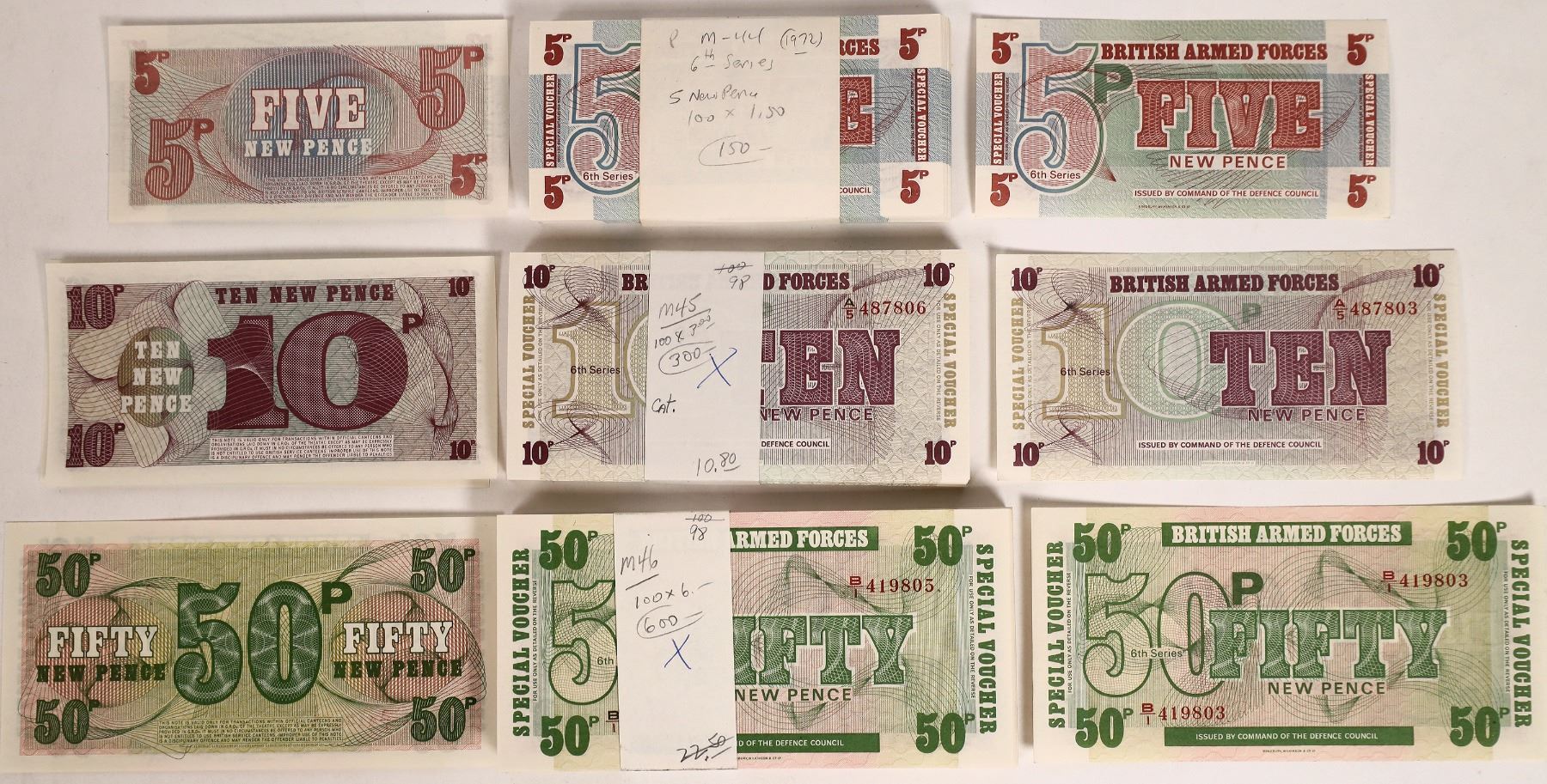 Three crisp uncirculated hundred note packets of currency for the British Armed Forces. Five pence (M47), ten pence (M48) and fifty pence (M49). The denominations were expressed in 'New Pence' to distinguish it from the pre-decimal pence. Two banknote printers were employed to print these notes. They were Bradbury Wilkinson and Company, and Thomas de la Rue and Company.