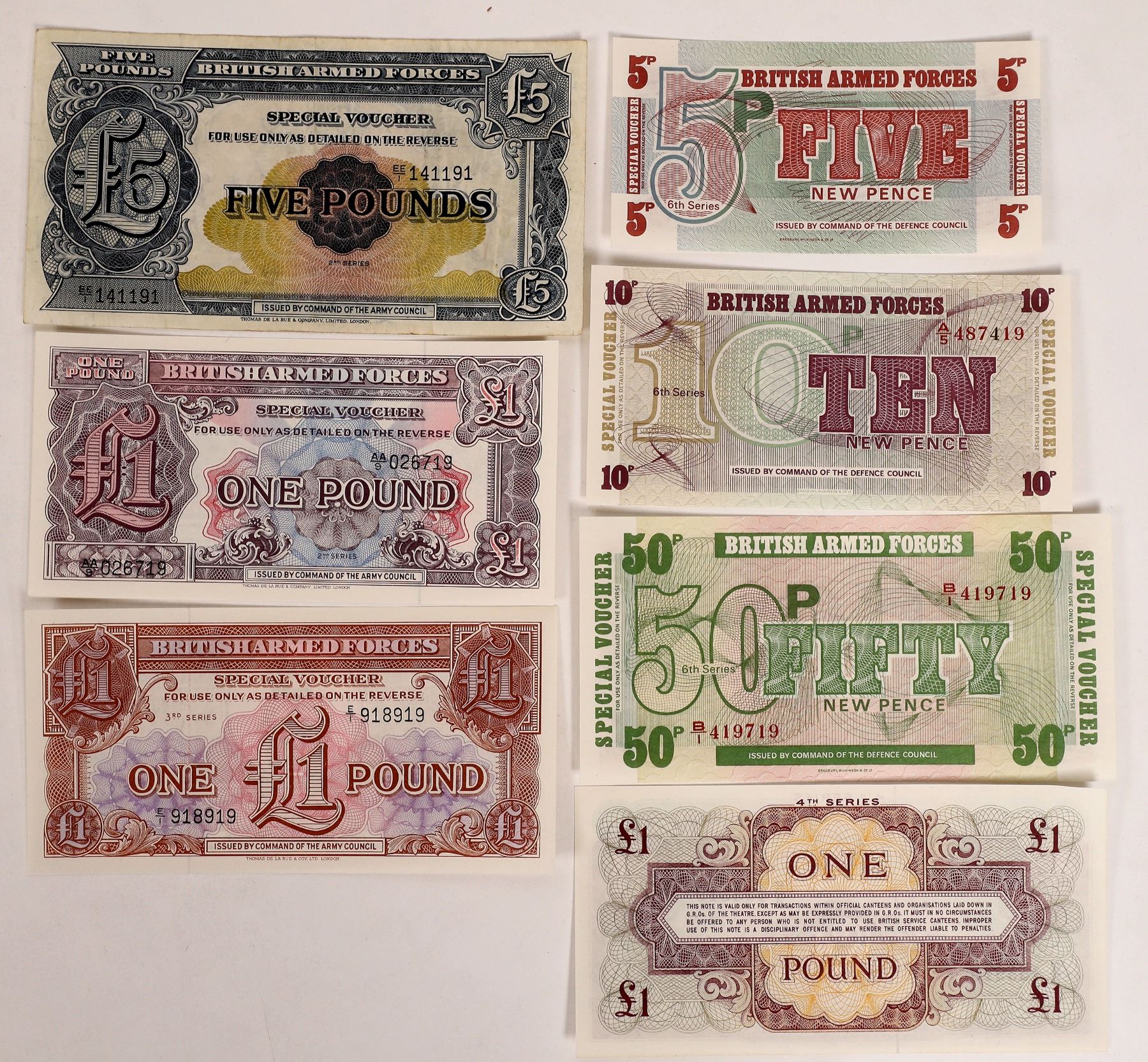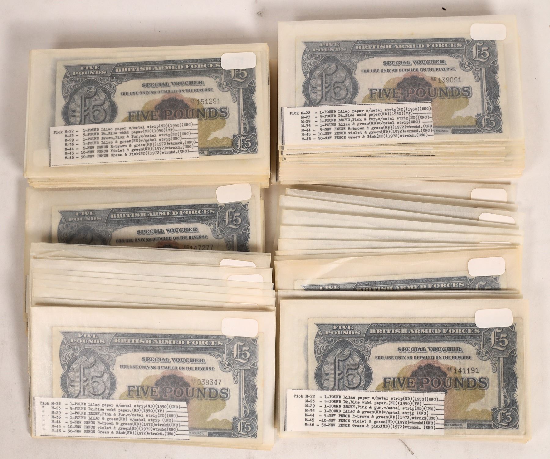 Dealer lot of over 100 sets of British Armed Forces currency. Crisp uncirculated sets of seven notes: Pick # M-22 (one pound lilac); M-23 (five pound dark blue); M-29 (one pound brown); M-35 (one pound lilac & green); M-44 (five new pence); M-45 (ten new pence); M-46 (fifty new pence). Issued from 1950-1972.