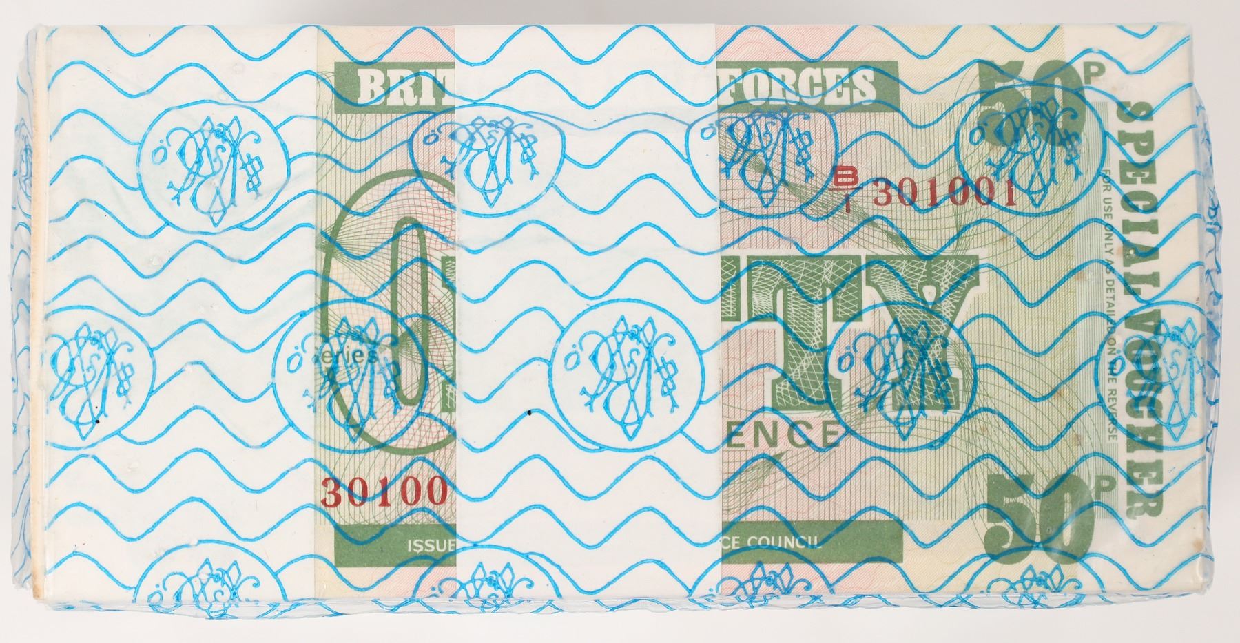 British Armed Forces Special Vouchers: PM46 50 new pence (1972). Sixth series unopened brick of 1000, crisp uncirculated, sequentially numbered notes. United Kingdom