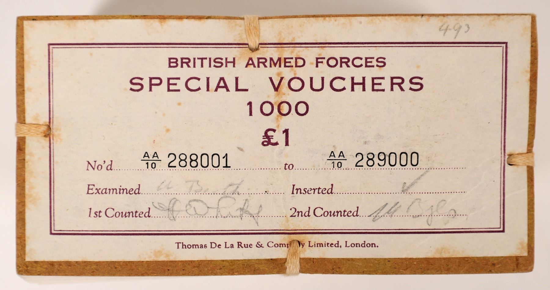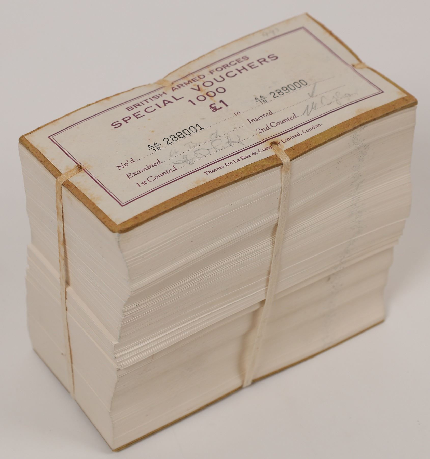 British Armed Forces Special Vouchers: PM22 one pound (1948). Second series unopened brick of 1000, crisp uncirculated sequentially numbered notes.