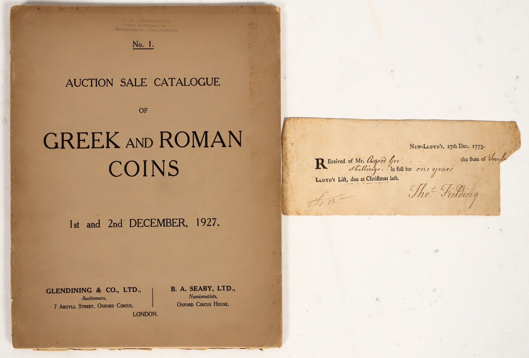 Lot of two English things: 1) Auction Sale Catalogue of Greek and Roman Coin 1st and 1nd December, 1927; 32 page catalogue, with 23 pages of illustrations; from the Firms of Glendining & Co. and B A. Seaby of London; cover detached. 2) Received of Mr. Osgood Gee the sum of twelve shillings in full for one year Lloyd's Lift, due at Christmas left. Signed Thos. Fielding. Headlined New Lloyd', 27th Dec. 1773. 7 1/2 x 3 inches, lower right corner missing.