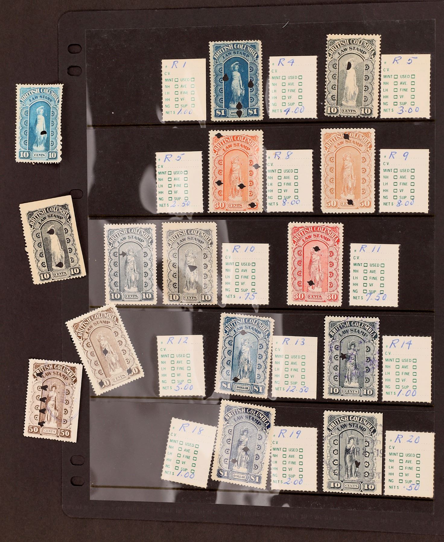 15 BC law stamps with punch cancels. State: City:British Columbia Date: Provenance: