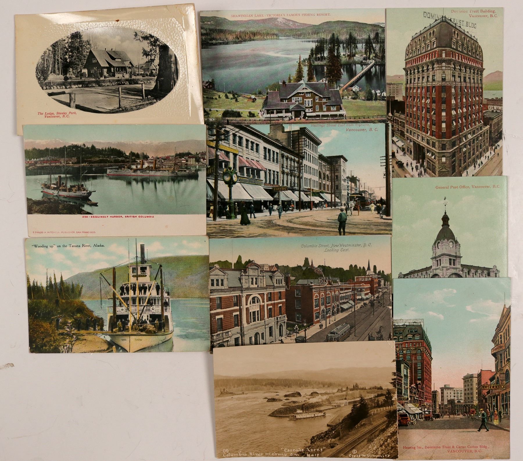 Lot of ten vintage cards, most from British Columbia. One of a steamboat "Wooding up" on the Tanana River in Alaska; one of "Cascade Locks" on the Columbia River in Oregon. Others include: the Lodge, Stanley Park, Vancouver; Columbia Street, New Westminster, B.C.; Hastings Street, Vancouver; General Post Office, Vancouver; Dominion Trust Building, Vancouver; Shawinigan Lake, Victoria; Esquimalt Harbor, B.C. Salvatore Falcone Collection