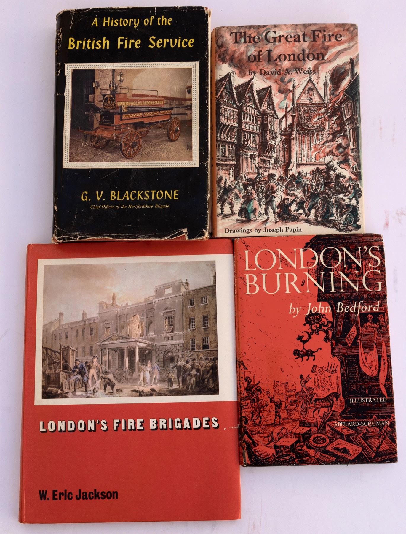 4 hardcovers recalling big British fires and responders. London's Burning by Bedford, A History of the British Fire Service by Blackstone, The Great Fire of London by Weiss, London's Fire Brigades by Jackson. State: City: Date: Provenance: Stuart Mackenzie Montana Ephemera Collection
