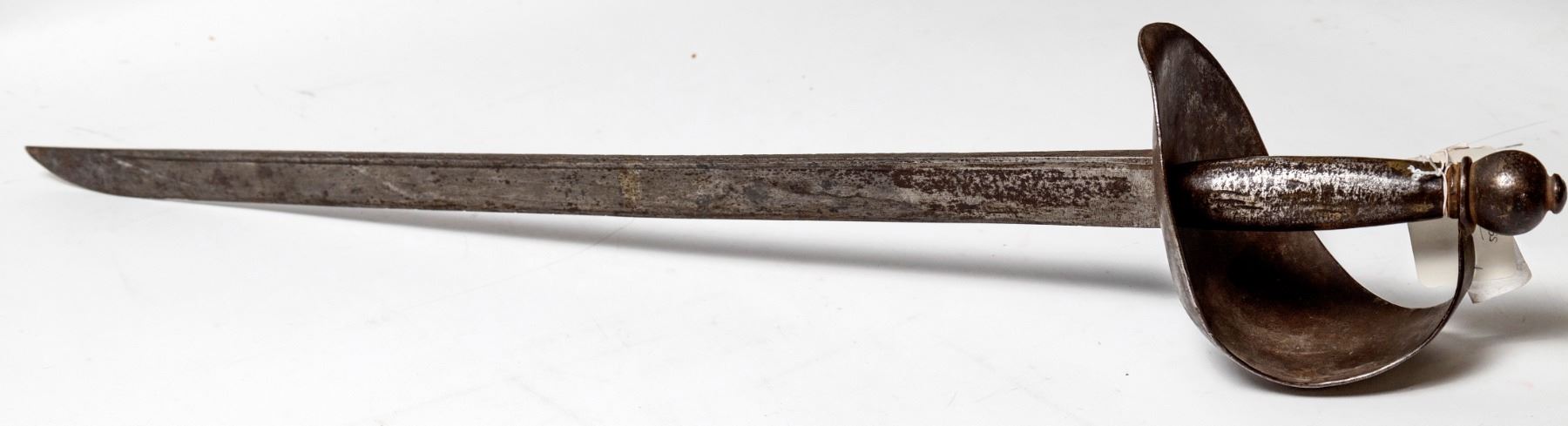 This is an 18th C. British Naval cutlass with a 25 in., blade 31 in. overall length, no scabbard. The guard and grip are steel and painted black to minimize corrosion (some paint remains on the guard). A crown is a stamped incuse on the left side of the blade near the ricasso with no other markings. Later versions had the royal cipher that looked like an arrowhead. This 25 in. blade has no curve and a full length fuller slot that disappears 3 inches from the point.