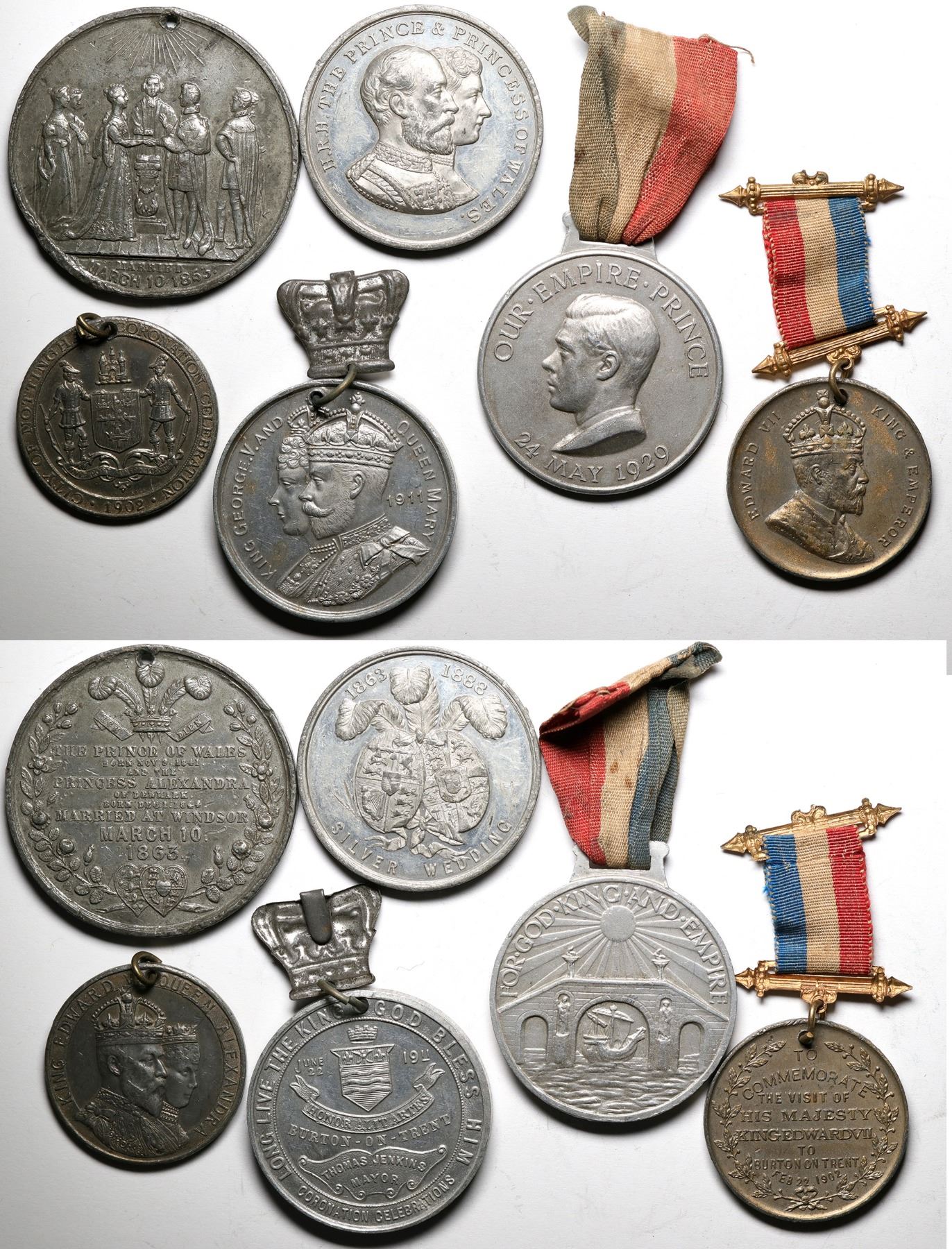 1) 1863 Prince of Wales Married to Alexandra. Obverse marriage ceremony scene. Reverse inscription in wreath. 46mm, White Metal. VF