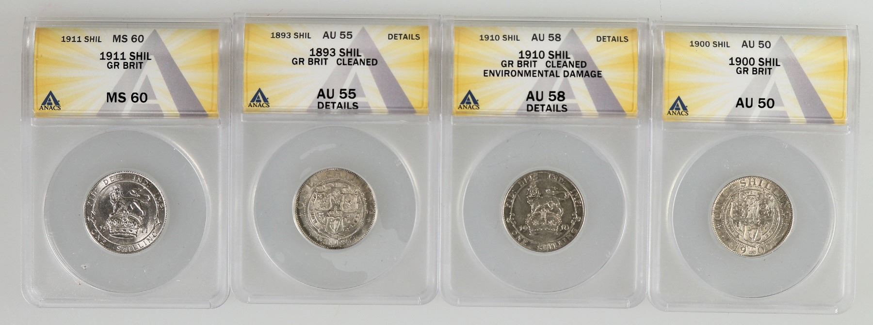 Four English shillings authenticated by ANACS: 1) 1893; AU 55 Details, cleaned; 2) 1900; AU 50; 3) 1910; AU 58 Details, cleaned, environmental damage; 4) 1911; MS 60.