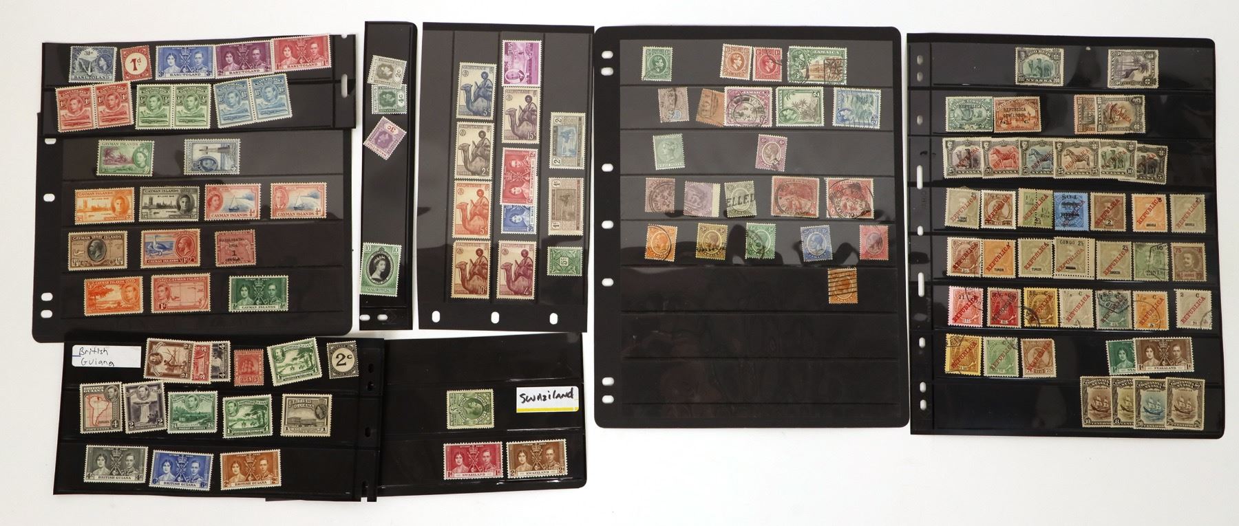 Early postage stamps from British Territories, (127 total). Jamaica, (22), 1/2-6, 1894-1900, all but one canceled; Honduras, (7), 1/2-3, 1934-38, all canceled; Guiana, (14), 2-24, 1937, mint; Nyassaland (16), 1/2-200, 1937, mint; Mauritania, (12), 1-20, 1937, mint; Swaziland, (3), 1/2-2, 1937, mint; Mauritius, (4), 2-10, 1953; Basutoland, (11), 1/2-3, 1937, mint; Cayman Islands, (12), 1/4-4, 1937-46; Miscellaneous (26). *Stamps are listed by countries or regions, (approximate count), denominations, approximate dates if available, number canceled indicated (otherwise mint).