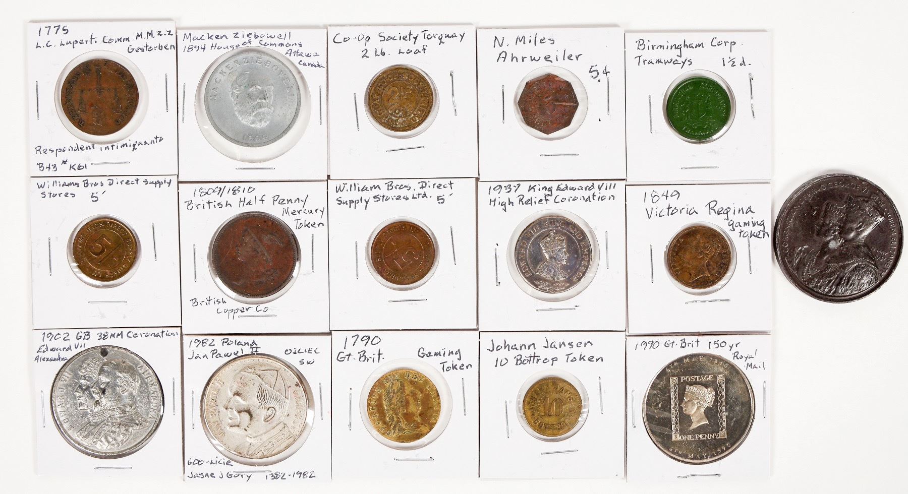 Fifteen tokens and medals from the United Kingdom: 1937 George VI/Elizabeth Coronation; 1799 George III gaming token; 1902 Edward VII coronation; 1990 150th anniversary Royal Mail; 1849 Victoria gaming token; 1937 King Edward VIII high relief coronation; Williams Bros. Direct Supply Stores; 1810 British half penny mercury token, many more.