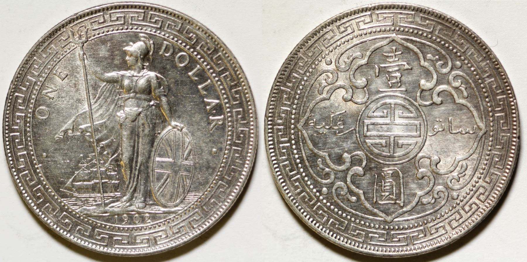 KMT5, .900 silver, 39 mm, 26.96 grams. Engraved by George William de Saulles. Bombay mint. Obverse: Britannia standing on shore, holding a trident in one hand and balancing a British shield in the other, with a merchant ship under full sail in the background. On the reverse is an arabesque design with the Chinese symbol for longevity in the center, and the denomination in two languages - Chinese and Jawi Malay. Uncertified, AU. Possibly worth getting certified. State: UK City: Date: 1902 HWAC# 85519