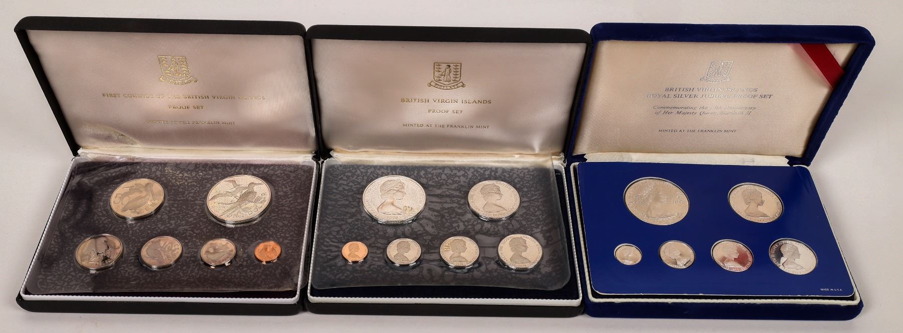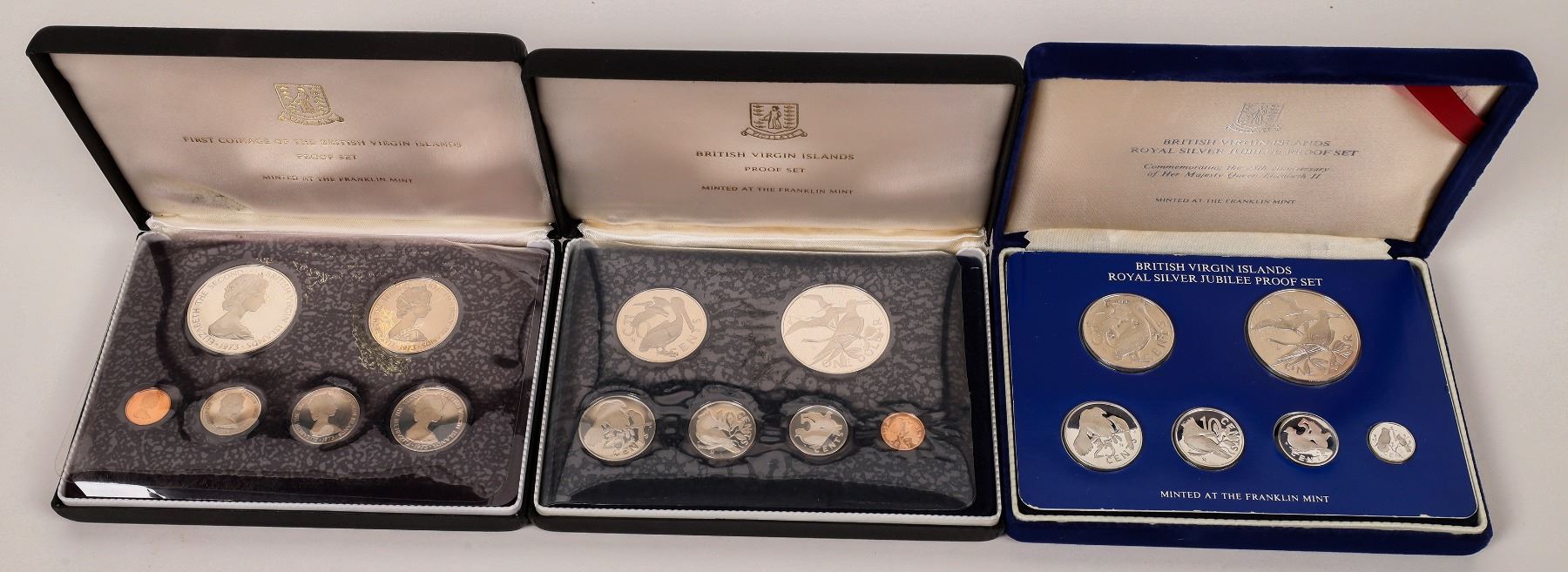 Lot of three British Virgin Islands proof sets minted at the Franklin Mint. 1973 (first year, six coins); 1974 (six coins); 1977 Royal Silver Jubilee commemorating the 25th Anniversary of Her Majesty Queen Elizabeth II, six coins. All in original boxes and cases with certificates of authenticity. Virgin Islands