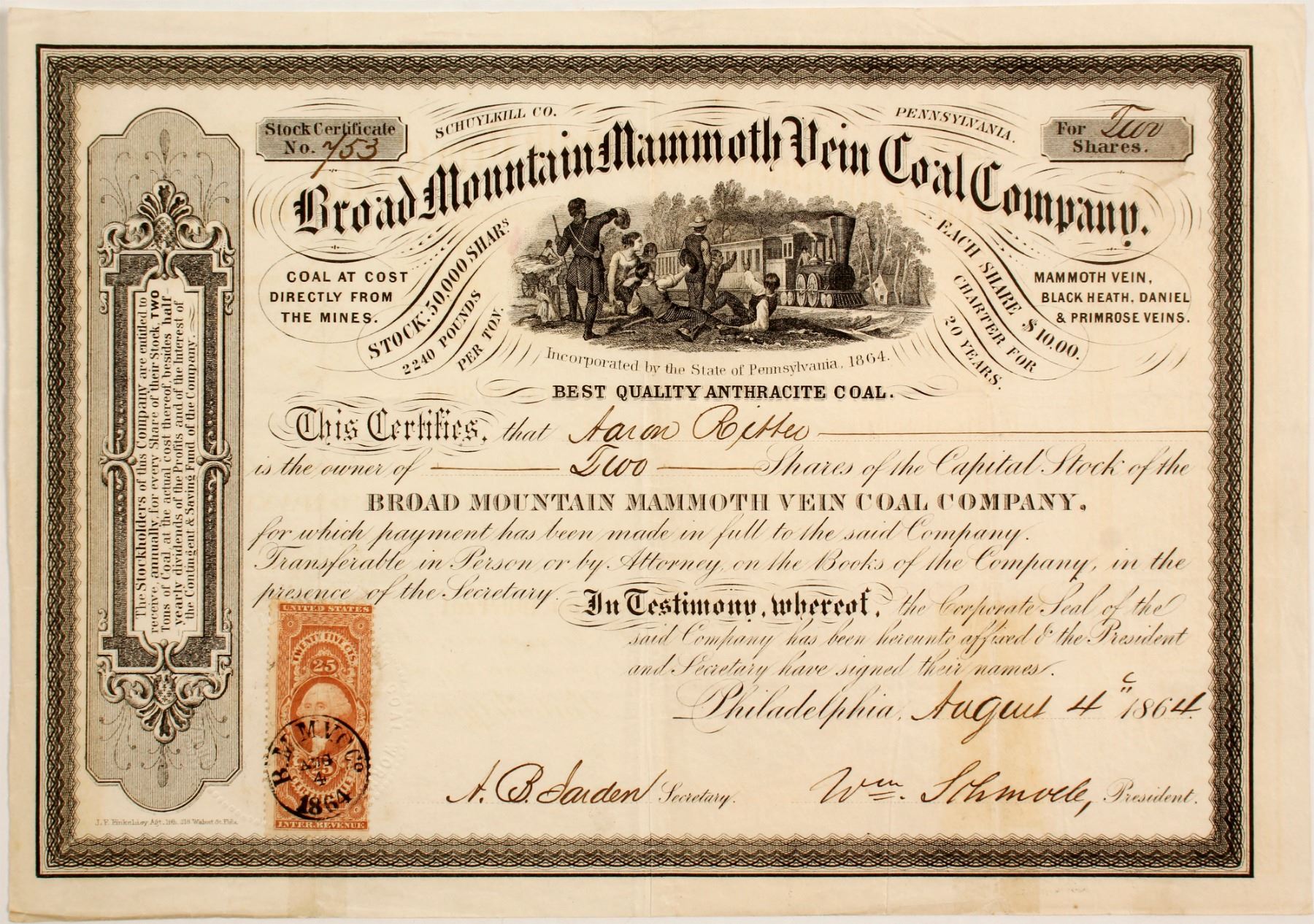 # 753 die 2 shares to Aaron Ritter. Signed by AB Jarden(?) and president William Schmoele(?). Dateline Philadelphia 1864. Incorporated 1864. "Coal at cost directly from the mines." Includes "Mammoth Vein, Black Heach, Daniel & Primrose veins." "Best Quality Anthracite Coal." 25c Certificate Revenue Stamp. Vignette of citizens watching a steam train roll by. Discoloration where revenue stamp was pressed against other side of stock. Very nice condition! The Mammoth Vein was an impressive anthracite coal seam in northeastern Pennsylvania. Obsolete American Securities and Corporations reported in 1891, "Last report filed in 1864. Pennsylvania Charter void 1883, when three years' taxes were unpaid. Stock worthless." Ken Prag Collection