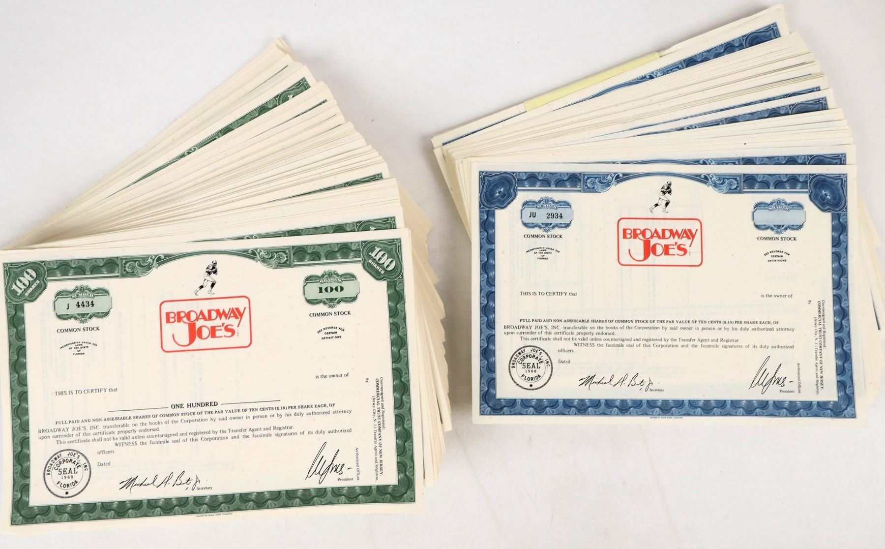 There are about 500 unissued stock certificates for the restaurant chain Broadway Joe's of Florida. These are green stocks issued in 1969 defunct by 1972. "Broadway Joe" Namath was the winning quarterback for the New York Jets in the 1969 Super Bowl 3. There is a vignette likeness of Joe center of the certificate. Jets fans take it home. Please see photo for details.