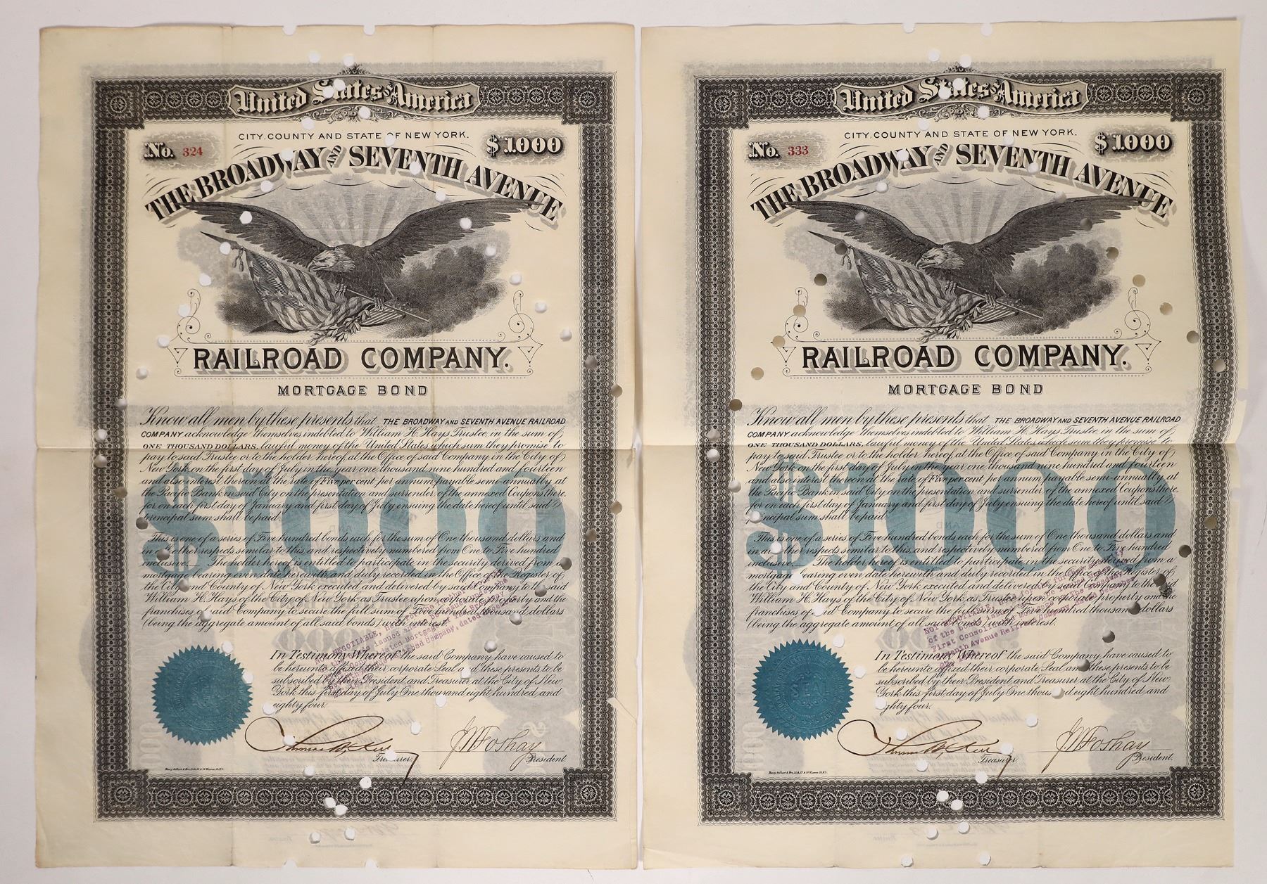 2 i/c 1884 Broadway & Seventh Avenue Railroad bonds, $1000. New York Ken Prag Collection