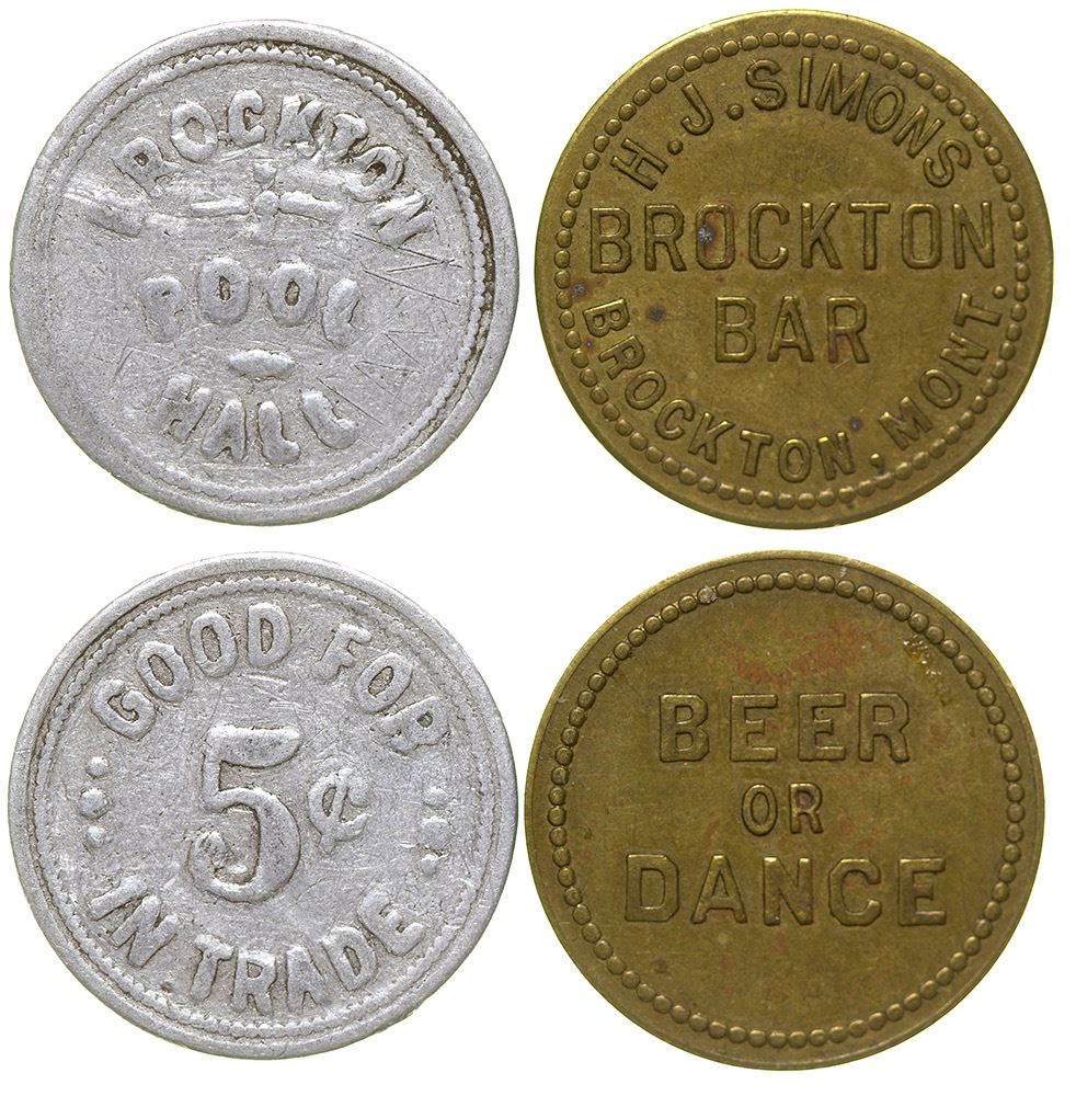 1) Round. Brass. HJ Simons / Brockton / Bar / Brockton, Mont. // Beer / or / Dance. 2) Round. Aluminum. Brockton / Pool / Hall // GF 5c IT. Worn. City: Brockton State: Montana Date: ID: 37174