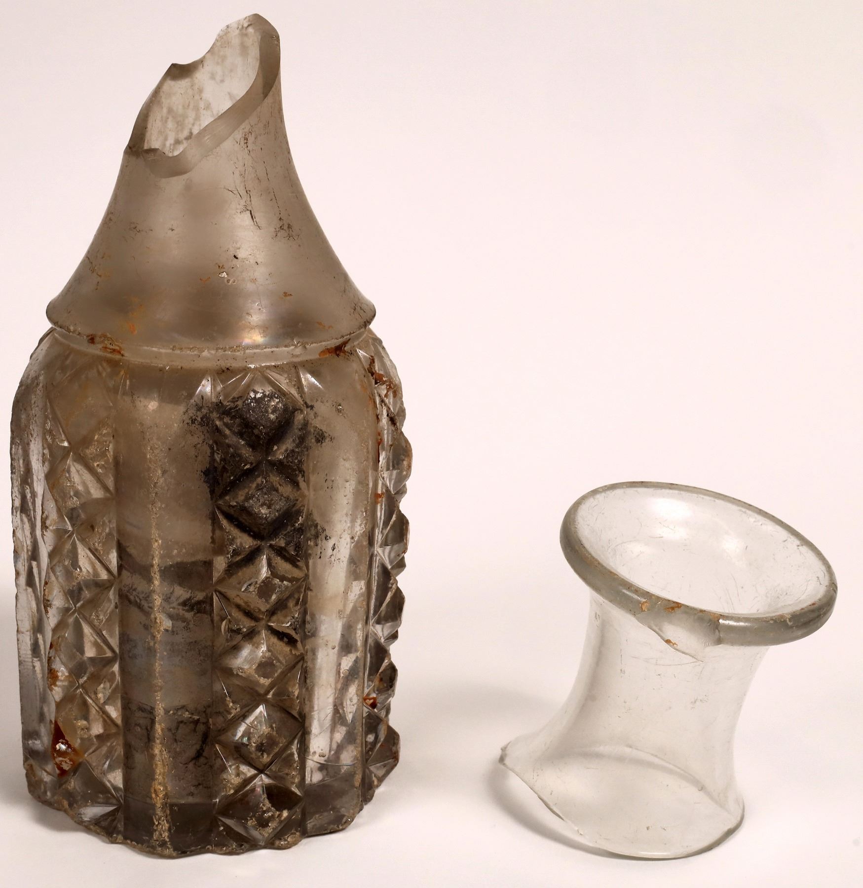 A broken glass decanter without top portion. Significant chipping and wear to exterior. 2" bottom light crack. Dried ocean silt inside decanter. 8x4". Cruet clear wide mouth top shard. Thick glass with large lip chip 3.75x2.25".