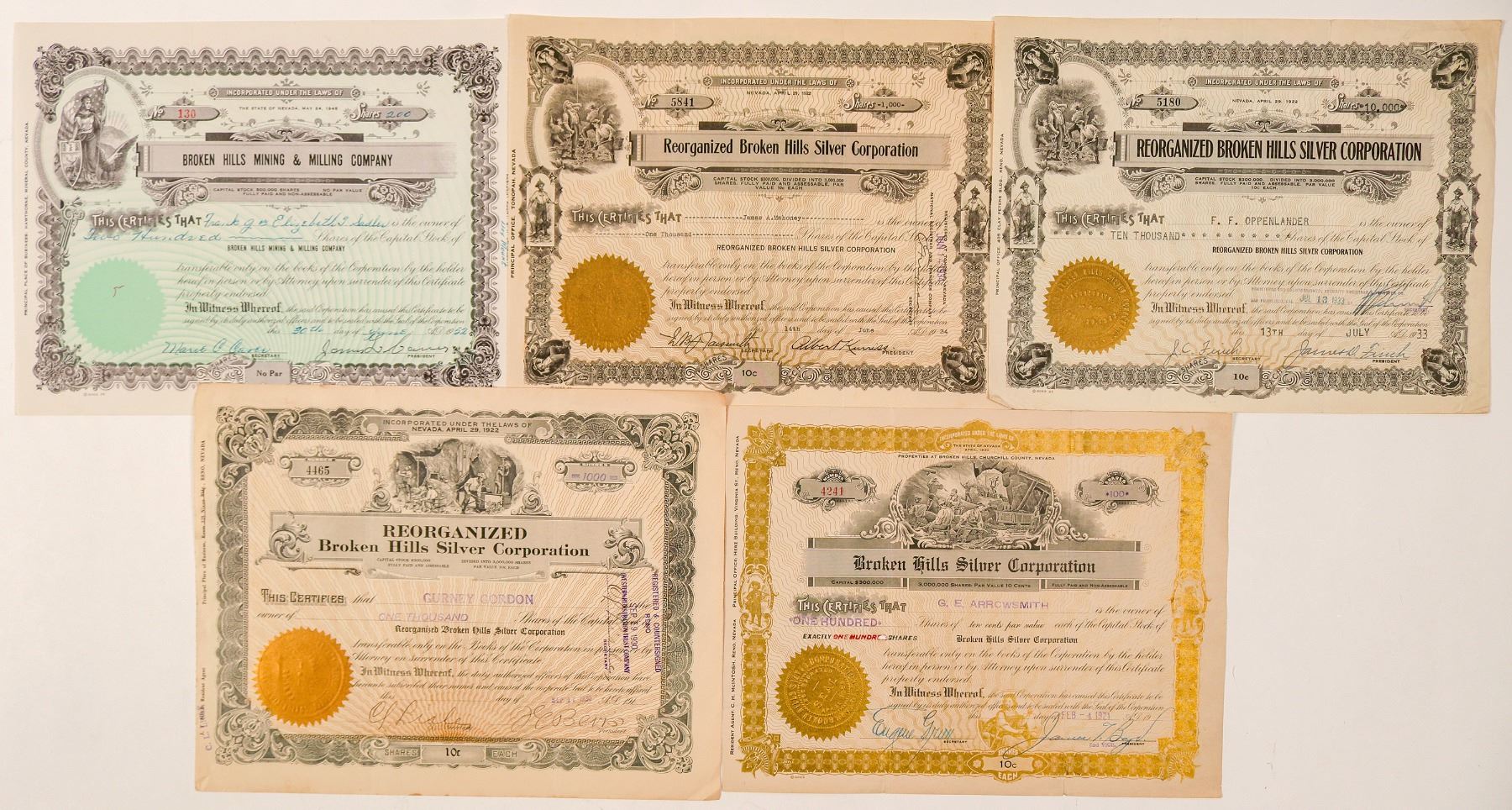 Lot of 5 different. Broken Hills is a ghost town in Mineral County near the border of Churchill County. Peaked 1915-1920. 1) Reorganized Broken Hills Silver Corporation. Three different, issued 1930-1934. Mining vignettes. 2) Broken Hills Mining and Milling Company. Issued in 1952, not cancelled. 3) Broken Hills Silver Corporation. Issued in 1921, not cancelled. Mining vignette. Good condition. Please inspect. Ken Prag Collection