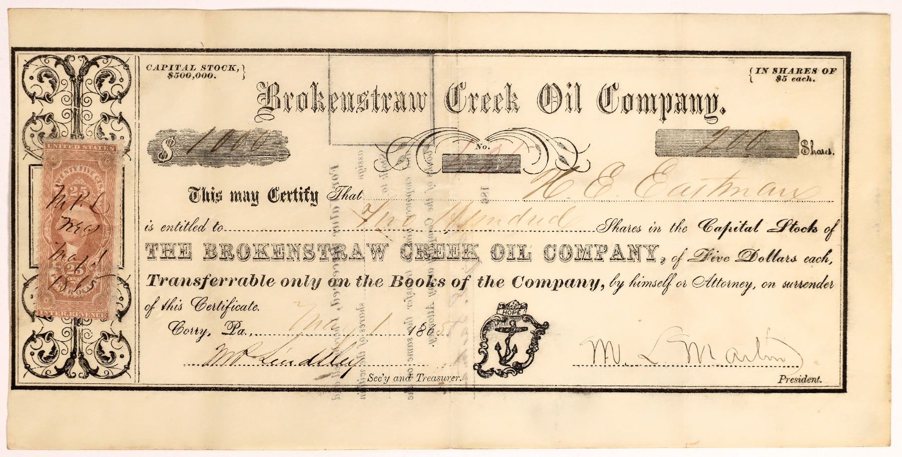 No. 435, issued for 200 shares to H.E. Eastman in Corry, Pennsylvania, 1865. Signed by president ML Martin and secretary Lindley. Not cancelled. Black border and print with small vignette of anchor with "Hope" printed above. 25 cent US IR stamp attached on the left. 4.75 x 9.5" Folds. No information found about this company. Corry was near the oil discoveries in Titusville. In 1866, there was an oil "belt" reported from Oil Creek to Brokenstraw Creek. Brokenstraw Creek is a 37.1-mile tributary of the Allegheny River in Warren County, Pennsylvania.