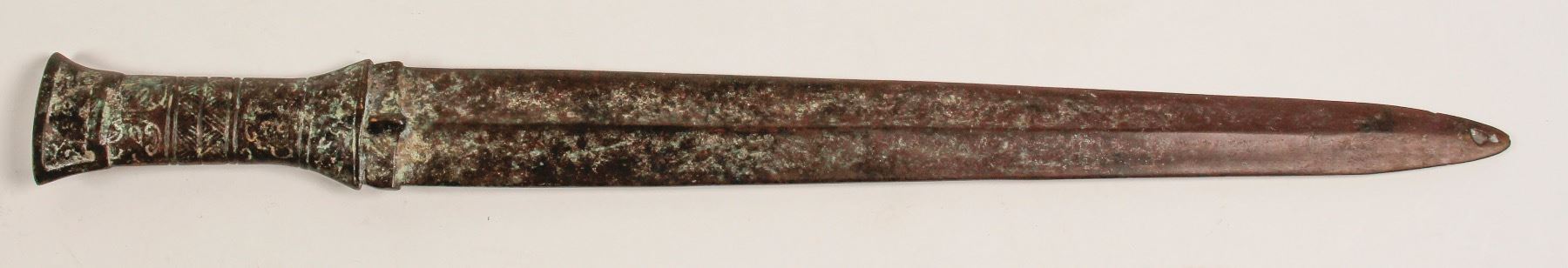 This is a cast bronze sword 19 3/4 in. (50 cm) overall length with 4 3/4 in ( 12 cm) grip. All bronze casting believed to be made between 1200-3000 B.C.. Chinese characters along the side of one edge. Date: Location: HWAC# 40754