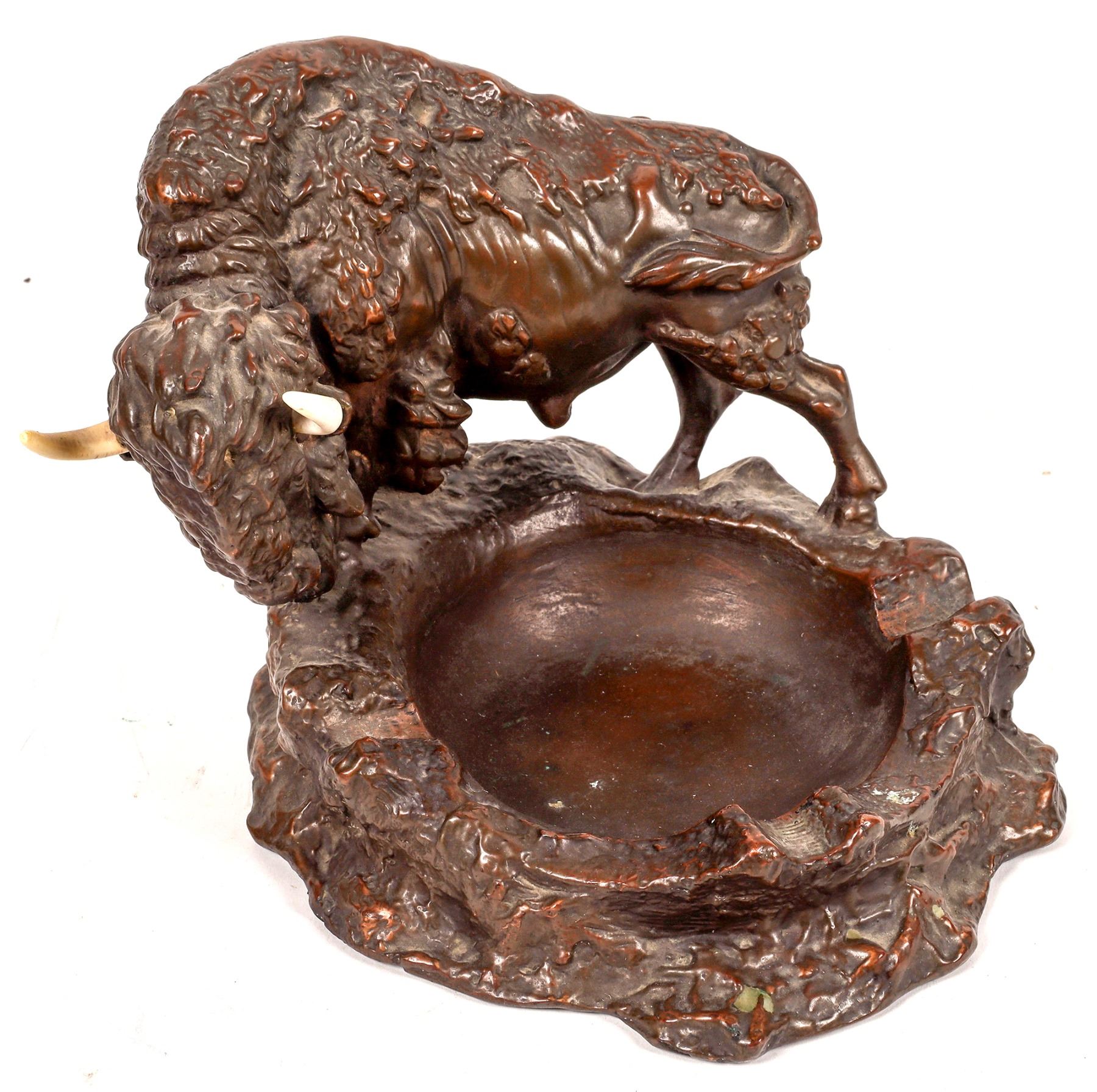Unsigned but with copyright 1928 on back base, Armor Bronze, bronze clad buffalo with 2 white horns ashtray. 7.5x8.8x9.5".