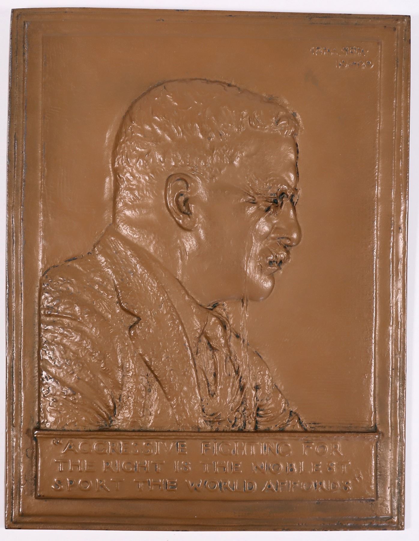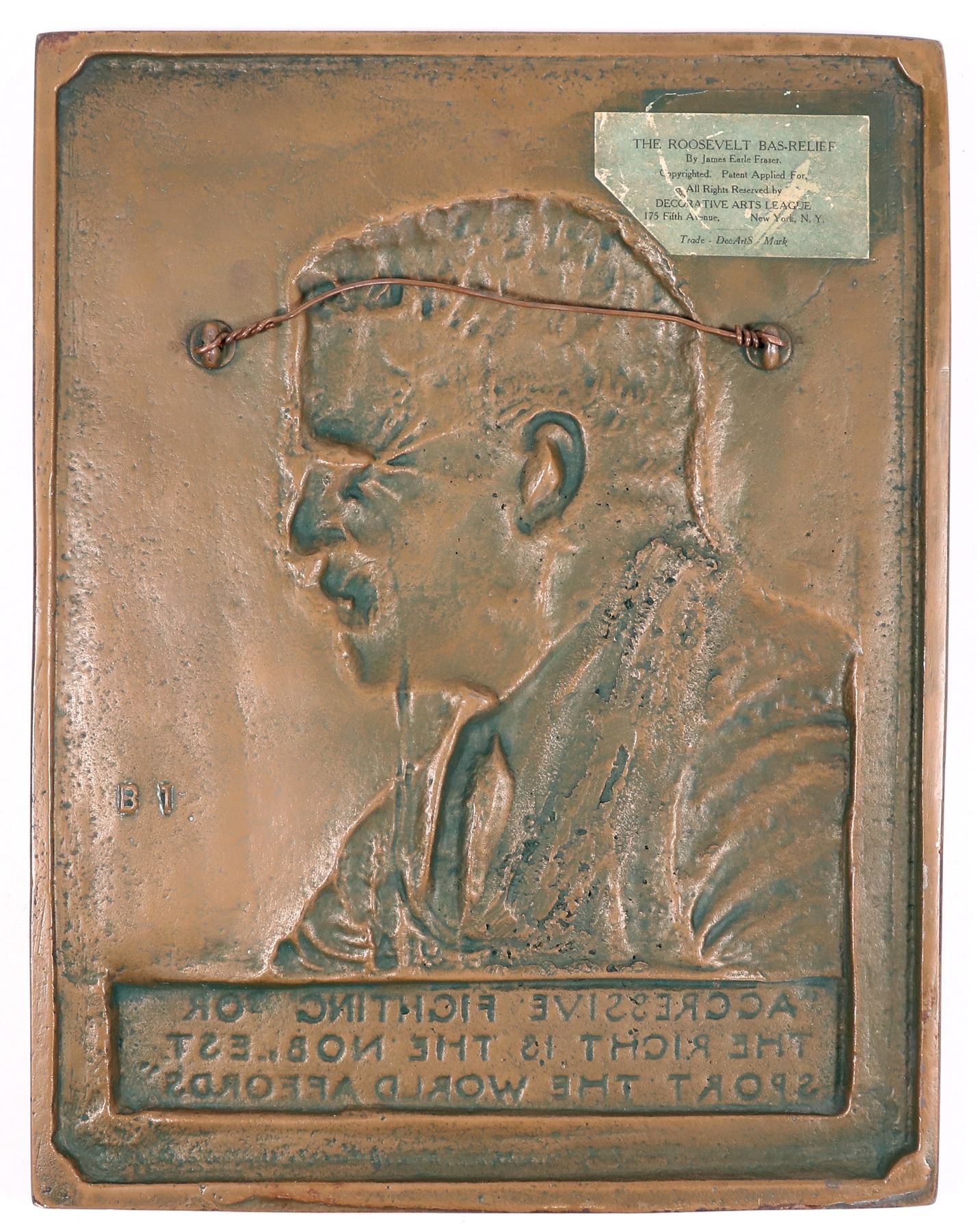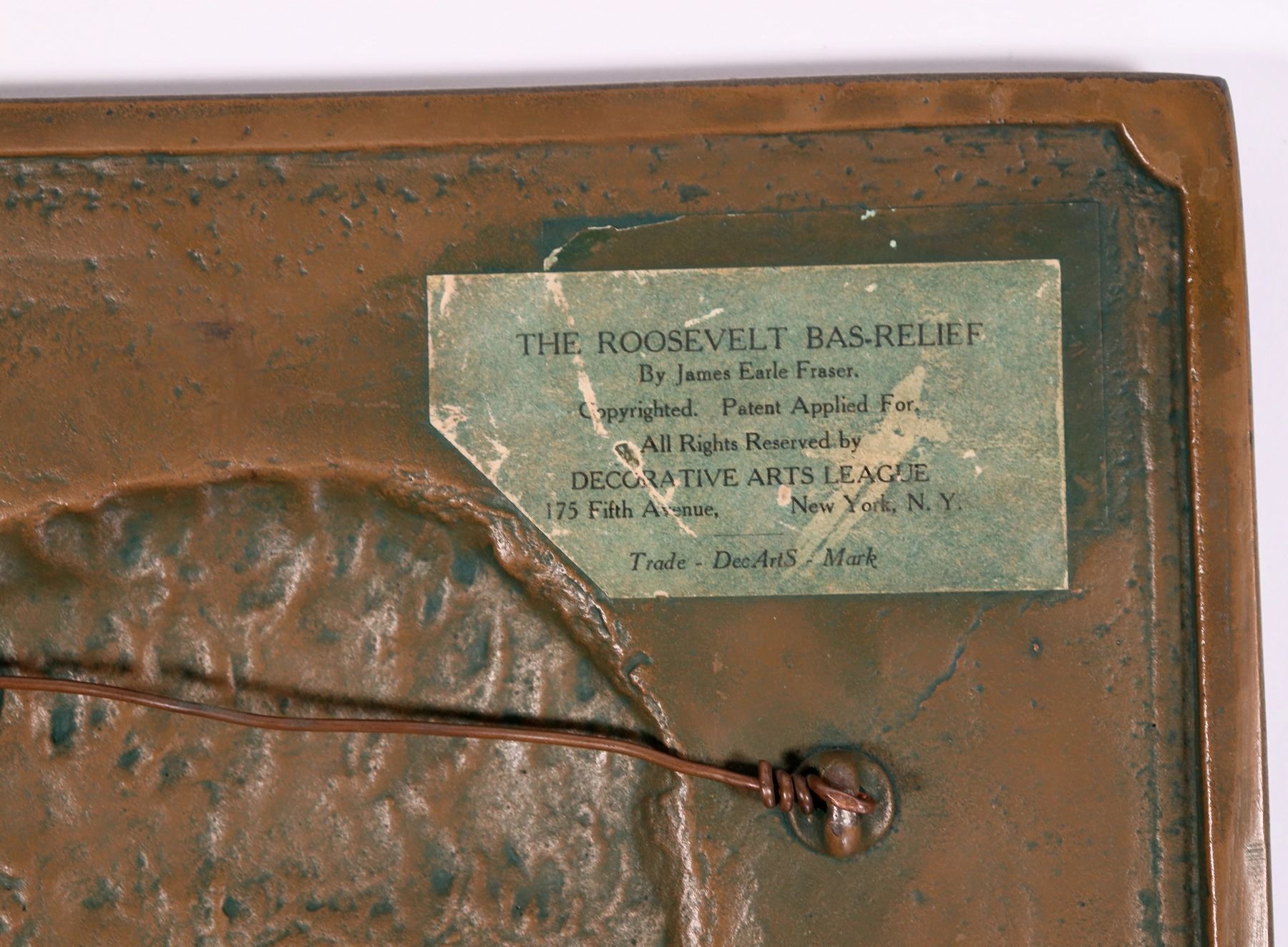 10" x 13" signed at upper right. Excellent condition. On the back is the original paper label "The Roosevelt Base-relief/ by James Earl Fraser / Copyrighted. Patented applied for / all rights reserved by / Decorative Arts league / 175 5th ave New York, NY. This is cast iron painted with a bronze hue. It is possible all were made in this manor and because of their appearance were thought to be bronze. This is an original with the original label attached on the back.