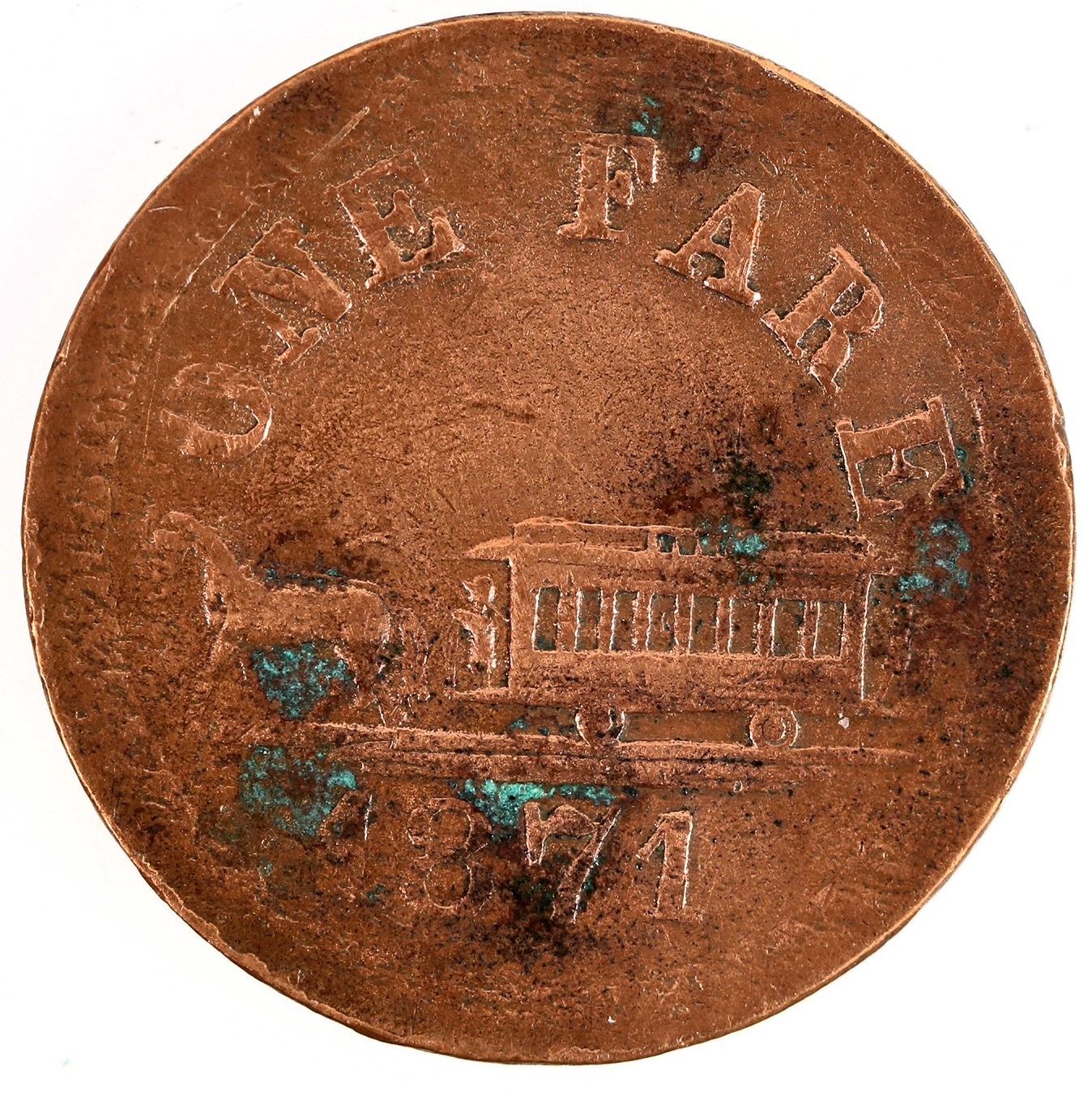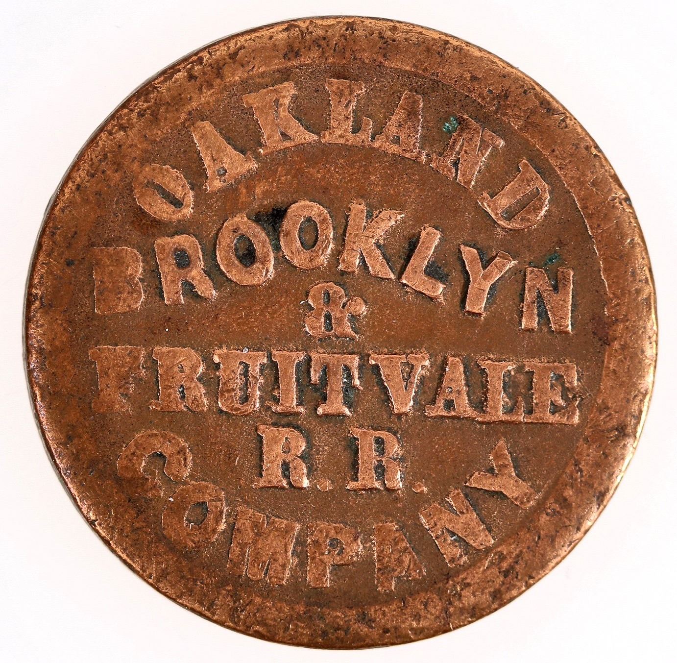 OAKLAND / BROOKLYN / & / FRUITVALE / R.R. / COMPANY // ONE FARE / 1871 (car has 8 windows); C, rd., 18 mm.