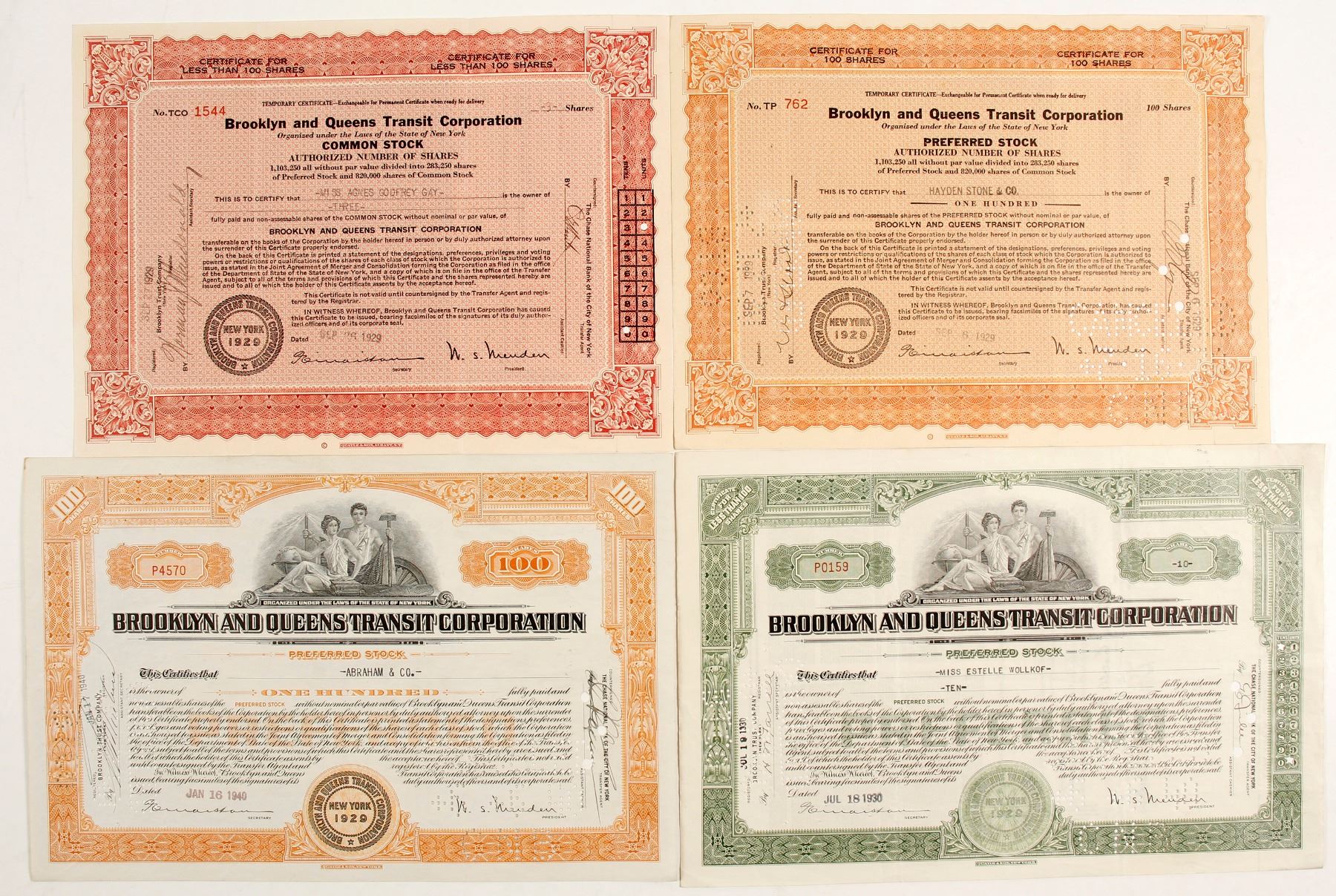 #762, 100 shares Pref. Stock. Cancelled. Temporary Certificate, orange. good condition, some wrinkling and pinholes. Purchased by major securities firm Hayden Stone & Co. 1929