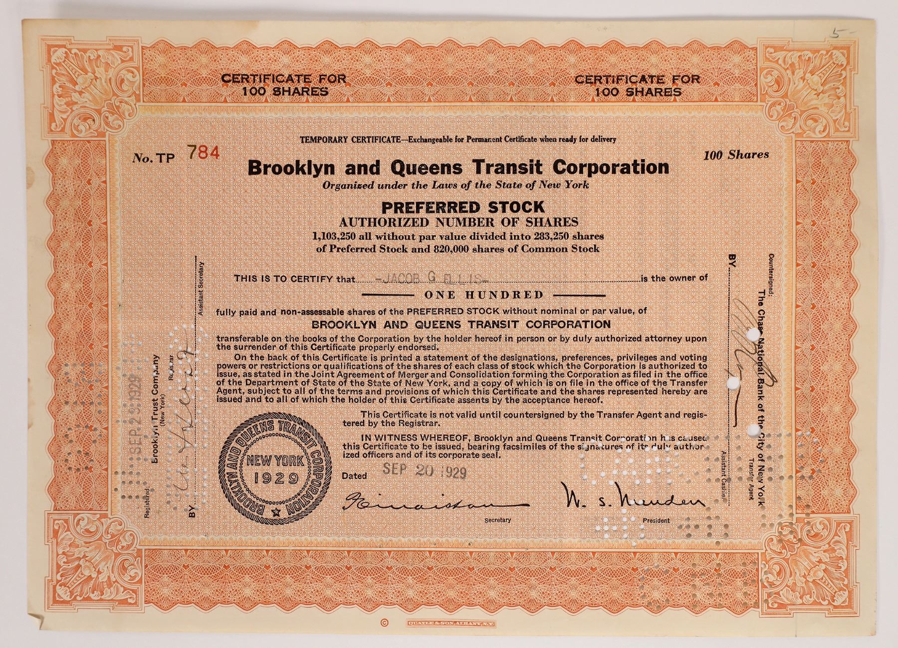 I/C 1929 Brooklyn and Queens Transit stock. New York Ken Prag Collection