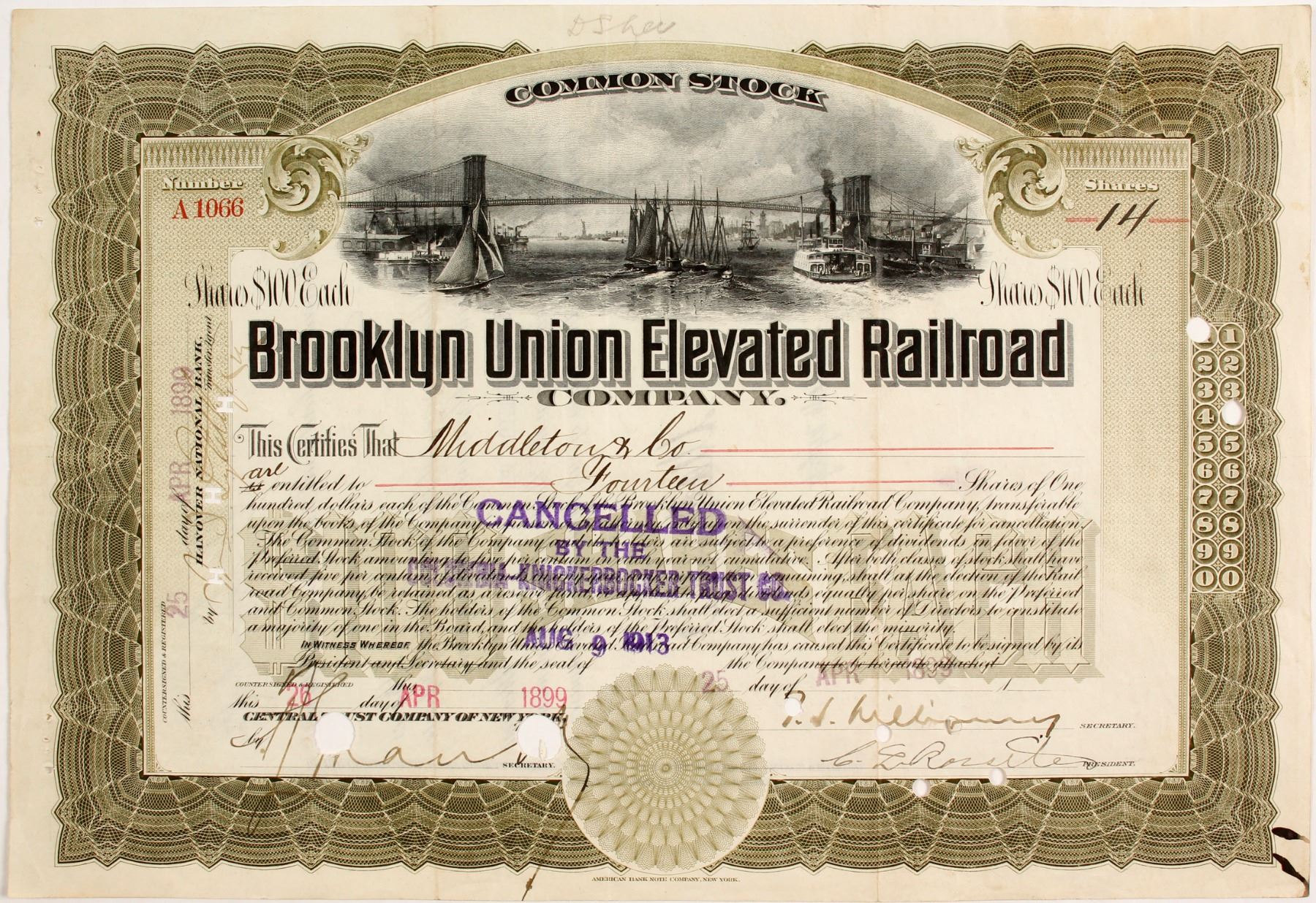 Cancelled on August 9, 1913, 14 shares of Common Stock of the Brooklyn Union Elevated Railroad Company, number A1066. Issued April 26, 1899. The Brooklyn Elevated Railroad was in Brooklyn, New York City. It ran between 1885 and 1899, then merged into the Brooklyn Rapid Transit. Co. Printed American Bank Note Company. Rare. Ken Prag Collection. State: City: Date: HWAC# 83153